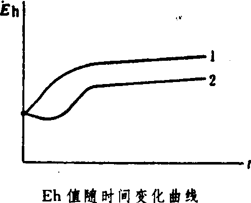 2O74.7毫克,加水1升,调pH值为6.2),以pH值计(可测Eh值)先测定硫酸亚铁液Eh值并记录,再称取样根3克,放入亚铁溶液中,在不断摇动搅拌下每隔1或2分钟一次连续测计Eh值,至30分钟止。测定结果以Eh值为纵坐标,时间为横坐标,绘出Eh值曲线,该曲线可能有两种形式(见图)。曲线2的初始Eh值下降是因根表存在的氧化铁膜所致,故其氧化力的起始值(Eh值)应从最低值算起,曲线上升速度指示根系氧化力大小,同一时间内,Eh值差异越大,曲线上升越快,即陡度越大时氧化力越强。