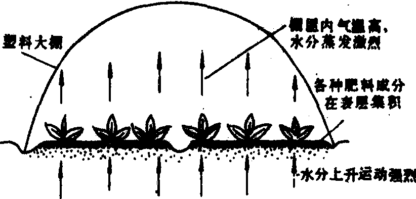 ❷大棚内气温高,蒸发强,土壤水分包括盐分上升运动强烈(见图1)。