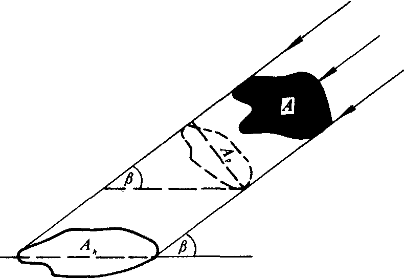 面积A在垂直太阳光线面上的投影Ap和在水平面上的投影Ah 投影在垂直太阳光线方向的面积 Ap=Ahsinβ 式中 β为太阳高度; 而物体截获的辐通量为: Ap Sp=(Ahsinβ)Sp=AhSh (1) 式中 Sp为在垂直太阳光平面上的辐照度。 如果物体表面积为A, 则其平均辐照度为: Sh=(Ah/A)Sh=(Ah/A)sinβ·Sp (2) 式中 Ah/A为外形因子, 可以从几何学原理或直接测定阴影面积或用阴影照相等方法求得。 |