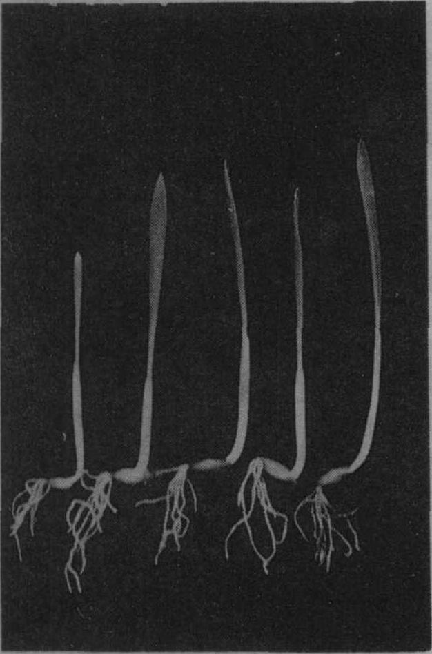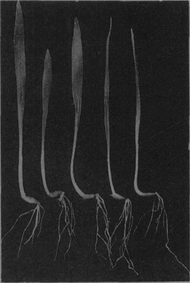 图1 大麦铝中毒根系生长畸形 上:为正常苗;下:铝害麦苗根系短粗而扭曲 植物耐铝性 铝是土壤组成中继氧、硅、铁之后的第四大元素,土壤全铝平均7%左右。铝对植物毒性较强,在含可溶性铝高的土壤上,不耐铝的植物无法生存,故铝是自然植被的控制因素之一。植物的耐铝性存在很大差异,茶树是著名的耐铝植物,含Al3+90毫克/千克的溶液对其生育没有不良影响;耐性弱的如大麦、棉花、苜蓿、莴苣在Al3+不到1毫克/千克溶液中生育不良,其中大麦在土壤溶液中含Al3+0.7毫克/千克时减产65%左右。不同作物耐铝性机理各异:❶有的作物根系分泌物能提高根域土壤的pH值,而沉淀铝,或者在NH+4和NO-3共存时选择吸收NO-3,从而使pH值提高。 ❷有的根分泌有机酸络合铝,减少和阻遏铝进入。 ❸根细胞壁OH-基密度高吸附沉着铝。 ❹根表阳离子代换量小,对Al3+这一多价离子吸收少,水稻可能属于此类。 ❺把铝积累于某些生理不活性部位,如茶树的老叶中铝可达30 000毫克/千克,新叶为100毫克/千克,而芽仅有60毫克/千克,表明老叶有捕捉并束缚铝的性质。 ❻使铝成为铝酸盐阴离子或络合物减低其毒性。 ❼使铝难于接近致害部分如细胞核、线粒体。有人认为组蛋白有遏制铝与DNA结合的作用。以上多种机制可以归纳为:排斥于体外;使在体内成为无害形式;积累于无害部位。