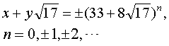 n = 0,±1 ,±2,… 并且基本解u0,v0与x2-dy2=1的基本解x0,y0之间有下述关系: