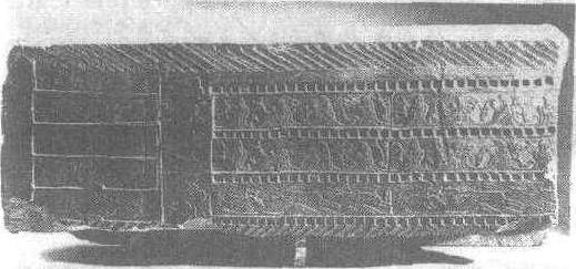 | 释义 | 侍卫、宴享、狩猎画像砖秦。长74厘米,宽25厘米,陕西省临潼县出土。陕西省博物馆藏。三幅画面由多种印模印捺成。分上、中、下三部分。上部的侍卫图由五名卫士组成,均头戴冠帽,身着长衣,执戟持盾,谦恭而立。中部的宴享图表现主宾对坐于列满耳杯、尊、壶等酒食器的席旁,边饮酒边欣赏乐伎表演的情景。下部的狩猎图分三排表现:在峰峦起伏,林木茂密,流云飞逸的山间,野兽或隐或现,一猎者正弯弓引箭,对准一只惊慌奔逃的小鹿,气氛十分紧张。构图简练,刻画生动,是迄今发现的秦代模印画象砖中内容最丰富的一件。