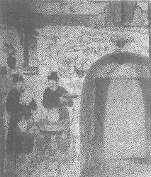 | 释义 | 侍者备娱场面图壁画辽天庆六年(公元1116年)。纵180厘米,横310厘米。河北省宣化县下八里张世卿墓后室南壁门洞两侧壁画,1974年发掘。画依券门而绕,分左中右3组。左侧一组是两名侍者为墓主人准备娱乐用品的场景。左立者为契丹人,髻发,圆领长袍,尖头靴,面型平圆,契丹人特征明显,他双腿分开直立,手捧黑箱,表情郑重。身旁侍者戴幞头,青衣白裤,手捧一钵,内盛骰子,斜视托箱者。券门右侧一组是两名侍者替墓主人准备宴饮用品。方桌上摆酒注、杯盏和瓷瓶,桌前置一矮几,盛酒的3只瓷瓶一字摆开。方桌后两名侍者服饰相同,皆戴幞头,着长袍,系腰带,一捧酒注,一托盘。托盘者似在回顾捧酒注者。券门的上部绘双龙,双龙间有花卉一盆,空隙处绘卷云。此画构图平衡,人物情节两两相对,甚至表情也有所对应。在墨线勾勒的基础上以平涂为主,重点部位稍加晕染,可看出画工娴熟的技巧。此画还具有历史参考价值,图中同时出现汉族、契丹族侍者,表现辽晚期契丹族的下层百姓为汉族贵族服役。