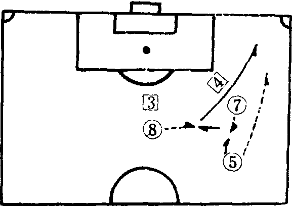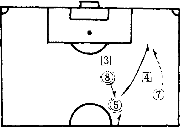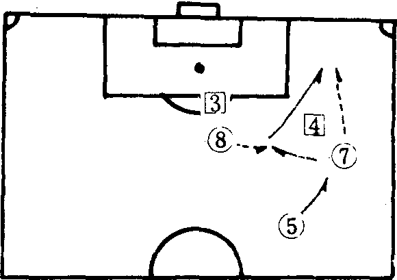 3打2配合 接应人摆脱了防守,形成3打2的优势,并通过传球配合越过防守的默契行动。基本方法:❶控球人摆脱了防守。5号摆脱防守后,把球传给回撤的7号,7号横传给8号,8号斜传给切入的5号;5号摆脱防守后,把球传给7号,7号横传给8号,8号斜传给切入的7号。❷接应人摆脱了防守。8号控球,5号突然摆脱接应,8号回传给5号,7号切入接5号的斜传球;7号控球,5