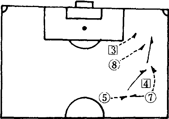 3打2配合 号突然摆脱接应,7号横传给5号后切入,接5号的斜传球,7号接球后,8号摆脱防守斜插,接7号的直传球。教学方法:❶采用2~3人,移动或跑动中,不定向地传接球练习,掌握好传球时机、传球力量和方向,提高传球的准确性和直接传球的能力。❷采用局部3打2的战术配合练习,熟悉传球路线,提高配合默契。 ❸运用等数抢截和比赛等对抗形式,加强摆脱接应意识,把握配合时机,在对抗中逐步形成配合默契。 |
