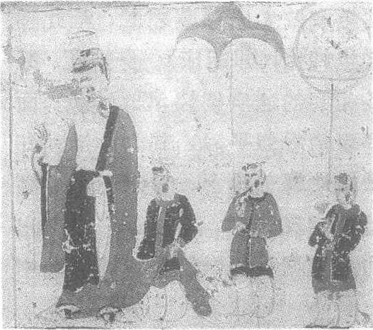 | 释义 | 供养人图壁画西魏。纵25厘米,横30厘米。甘肃省敦煌县第288窟东壁南侧壁画。此为男供养人像,一比丘持花于前引导。供养人戴笼冠,着绛色长袍,项有曲领,腹前束蔽,脚穿笏头履,身后一名僮仆为其提携袍摆。专家认为,这种服饰可能为汉晋时代流行一时的“狐尾箪衣”或“偏后衣”。其余两名僮仆一位举伞,一位持障扇。此为莫高窟现存最早的把施主带领仆从同绘一壁成组的供养人像。