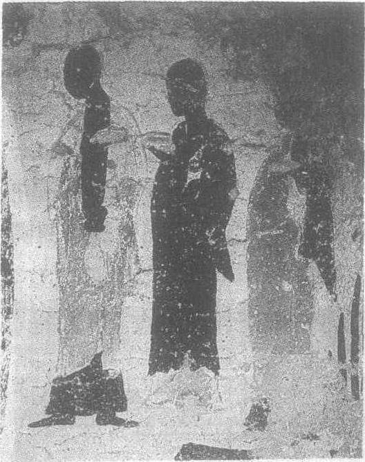 | 释义 | 供养比丘尼像壁画北魏。甘肃省天水市麦积山石窟第161窟东壁内侧壁画。石窟壁画中的女供养人前多绘比丘尼,以示她们引导善男信女走向佛国世界。图中的三位比丘尼均为斜侧面形象,身披轻薄的袈裟,手捧香炉作伫立状。虽因年代久远,脸面身体的颜色已经变黑,但仍可看出她们的身材苗条而匀称。面部线条柔和、清秀,女性温柔婉丽的特征仍清晰可见,所有这一切均表明作者绘画线条的高超技艺。