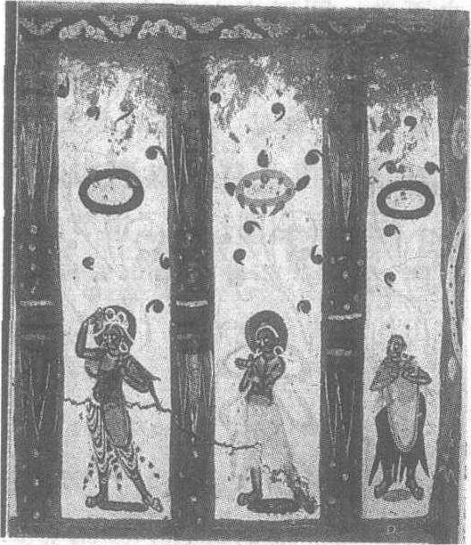 供养菩萨壁画北魏。纵110厘米,横75厘米。甘肃省敦煌县莫高窟第263窟窟顶人字披东披壁画。供养菩萨绘于红褐色椽干之间,每格以白色为背景,绘一供养菩萨。均上身裸露或袒右肩,作不同姿态,后有头光,并衬色泽淡雅的忍冬和莲花等。人物线条勾勒十分简练概括,具有很强的装饰性。