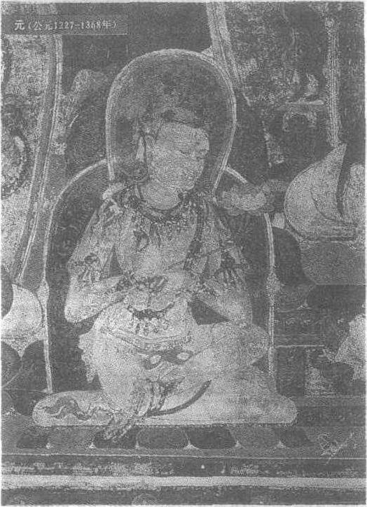 供养菩萨壁画元。纵114厘米,横110厘米。甘肃省敦煌县莫高窟第465窟窟顶壁画。菩萨戴花冠,面庞秀丽,五官纤细,凸凹明显。身材窈窕,佩项圈、璎珞、臂钏。盘腿坐于莲座之上,左手持莲花一枝,双目注视着莲花。神情温柔典雅,具有大家闺秀的风度。人物轮廓勾勒纤细刚劲,设色深沉淡雅,给人以莹润似玉的质感,是一幅很美的肖像画。