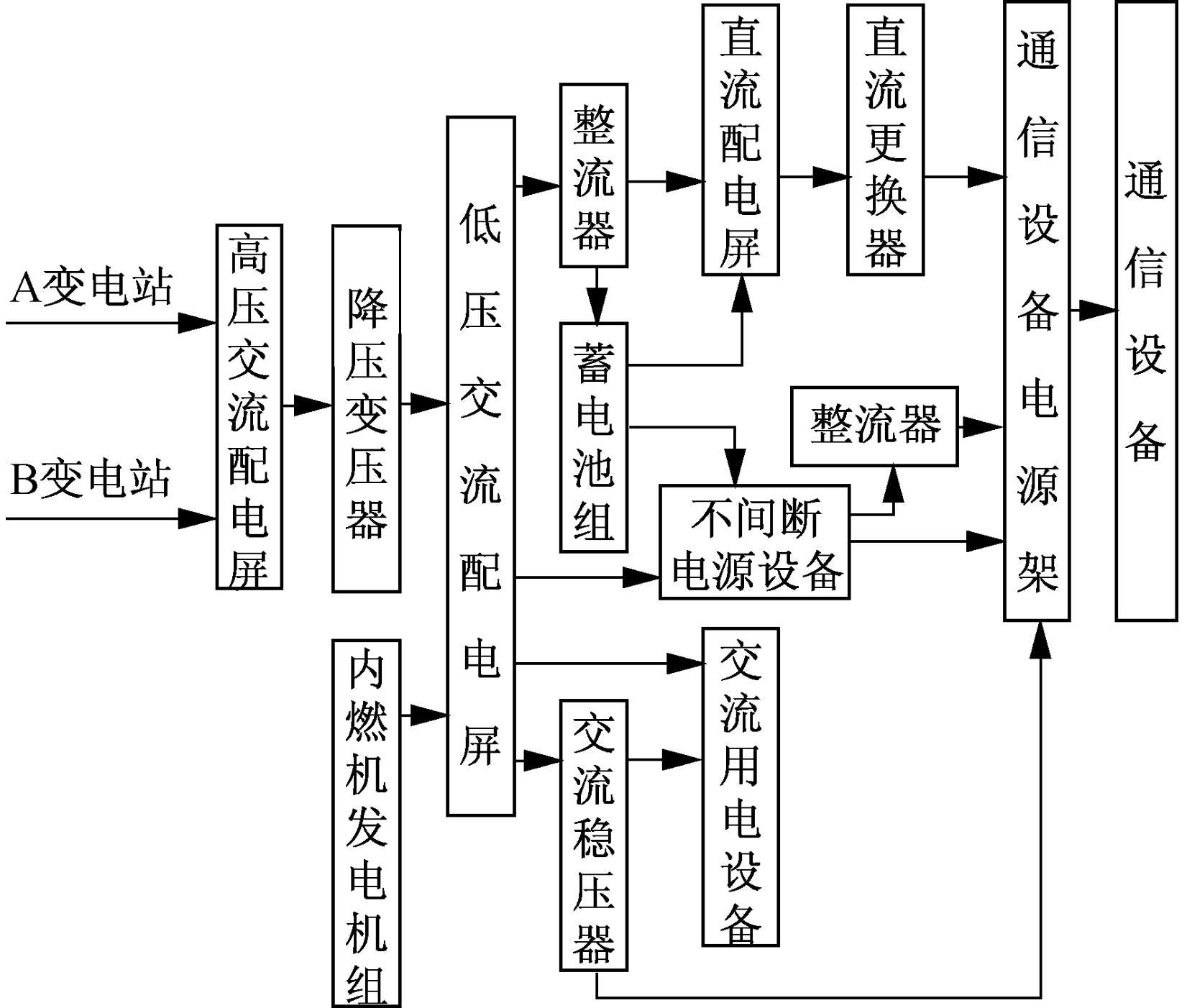 | 释义 | 供电系统power supply system按照通信设备等供电要求连接成的电源设备总体。由交流供电系统和直流供电系统组成。前者包括降压变压器、内燃机发电机组、不间断电源和高、低压配电屏等。为了提高供电的可靠性,较大的通信局(站)通常引入两路高压市电,一主一备切换使用,再经降压变压器将高压(10kV)变为低压(380/220V)。市电中断,则由自备交流电源,如内燃机发电机组、不间断电源供电。后者包括整流器、蓄电池组、直流变换器和直流配电屏等。整流器将交流电变为直流电,对蓄电池充电或与蓄电池并联浮充对通信设备供电。直流变换器将一种直流电变为另一种直流电,以适应通信设备的要求。供电系统已逐步采用微机监控管理,可将供电系统运行状态和各种电气参数送到微机监控管理中心,进行集中监控管理,实现少人或无人值守。