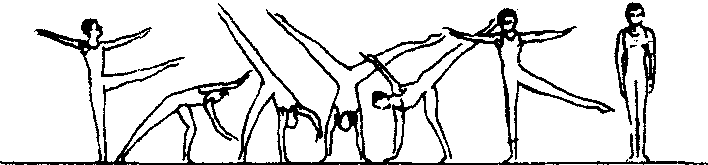 | 释义 | 侧手翻经手支撑,做经头向侧(围绕身体矢状轴)翻转1周的动作。动作要领:右脚站立,左腿侧举,两臂侧举开始,上体向左侧倒,左脚落地。接着右腿向侧上方摆起,左手外展撑地,左脚蹬地摆起,右手撑地,经分腿手倒立姿势向侧翻转,左手推离地面,右脚落地。右手推离地面,左脚落地成分腿开立。保护与帮助:保护者站在练习者的背后,两臂交叉,两手扶其腰两侧助其翻转。教学重点:在帮助下做侧起成分腿手倒立;做分腿手倒立侧翻落下成分腿开立。