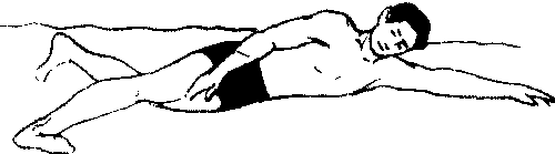 侧泳 ❶身体侧卧于水中,稍向胸侧倾斜,头半露出水面,下臂前伸,上臂位于体侧,两腿并拢伸直。❷收腿时上腿以大腿带动小腿前收屈膝,收至大腿与躯干约成90°角,小腿与大腿约成45~60°角。下腿大腿同时向后伸,脚要靠近臀部。翻脚时上腿脚掌向后,下腿脚面和小腿前面向后蹬剪腿时,两腿用大腿发力,上腿脚掌略向前做弧形蹬夹;下腿用小腿、脚背向后踢水,使两腿形成弧形剪水动作。 ❸上面臂移臂时,上体绕纵轴略有转动,入水点要远。入水时伸肩,前臂向后划水至肩垂直面时再用力推水。手出水时以肘领先,手放松屈臂前移。下面臂由屈肘开始前伸,然后向后划水。划水时要靠近胸侧下方。移臂时屈肘收手,掌心贴近身体,然后迅速前伸。 ❹两臂互相配合。上面臂入水时,下面臂划水至腹下;下面臂前伸时,上面臂划至上侧大腿旁;两臂于胸前交叉。 ❺呼吸与臂要配合。上面臂划水时,逐渐呼气,划到腹下做推水时吸气。移臂和入水时,头还原,闭气。 ❻完整动作配合。两腿蹬剪水一次,两臂各划水一次,呼吸一次。两腿蹬剪水后,在上面臂划水结束与下面臂前伸时,应有短暂的滑行动作。教学重点:❶掌握两腿蹬剪动作。可采用手扶池壁,身体侧卧,做腿的收、翻、蹬剪练习。也可在蹬池边后,身体在滑行中,两腿做收、翻、蹬剪练习。 ❷腿、臂动作配合。在蹬池边滑行中做臂腿配合练习。也可做短距离游练习。