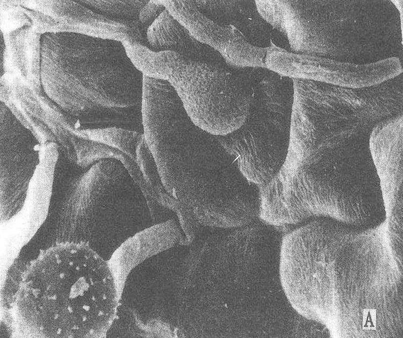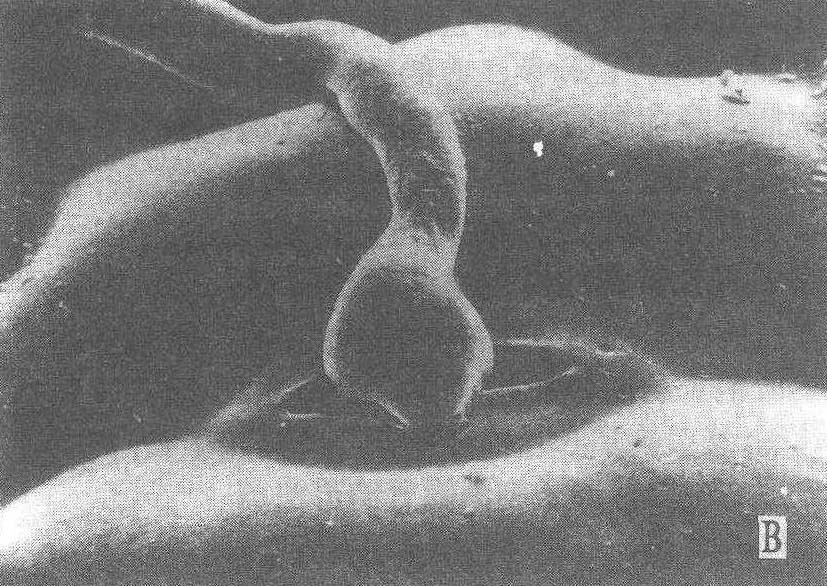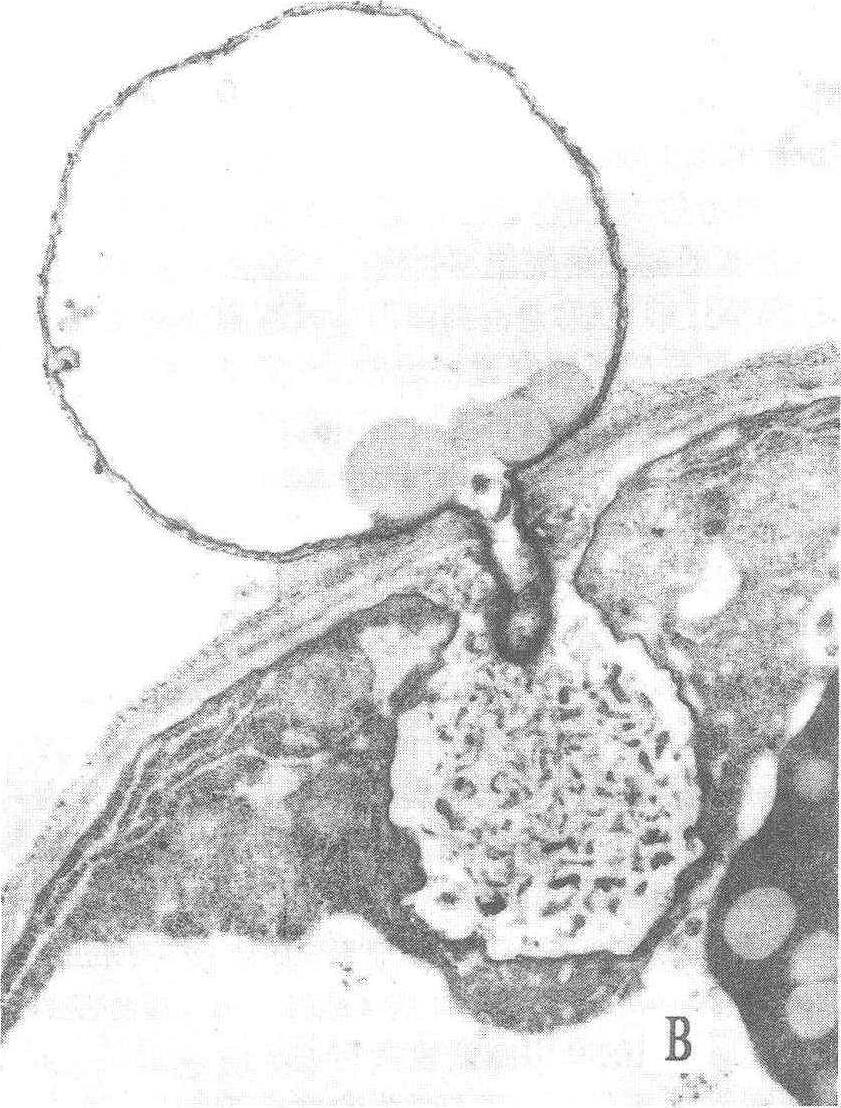 ❷附着胞形成。植物表面结构特征的变化和某些化学物质可以中止芽管的生长,刺激附着胞形成。当菜豆锈病菌的芽管到达气孔瓣时,气孔瓣的柔软特征便发生这两种作用(图1,A、B)。在小麦锈病菌等病原真菌中,寄主表面的类脂化合物首先刺激孢子萌发并控制芽管的生长方向,当芽管到达气孔时,这类物质含量的变化使芽管停止生长,此时气孔分泌物中的锌离子刺激附着胞形成。