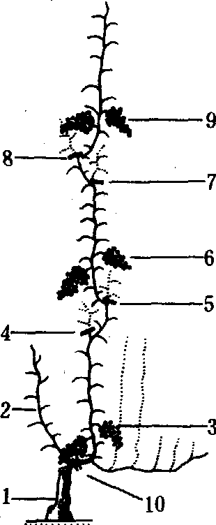 1. 主干; 2. 预备枝;3.第一次结果;4.第 一次摘心; 5.第一次 修剪;6. 第二次结果;7. 第二次摘心; 8. 二次修剪;9. 第三次结果; 10.冬季修剪部位