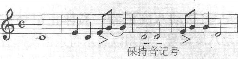 指用以表示奏满该音时值的符号。保持音记号为标记于音符符头一方的短横线。例:
