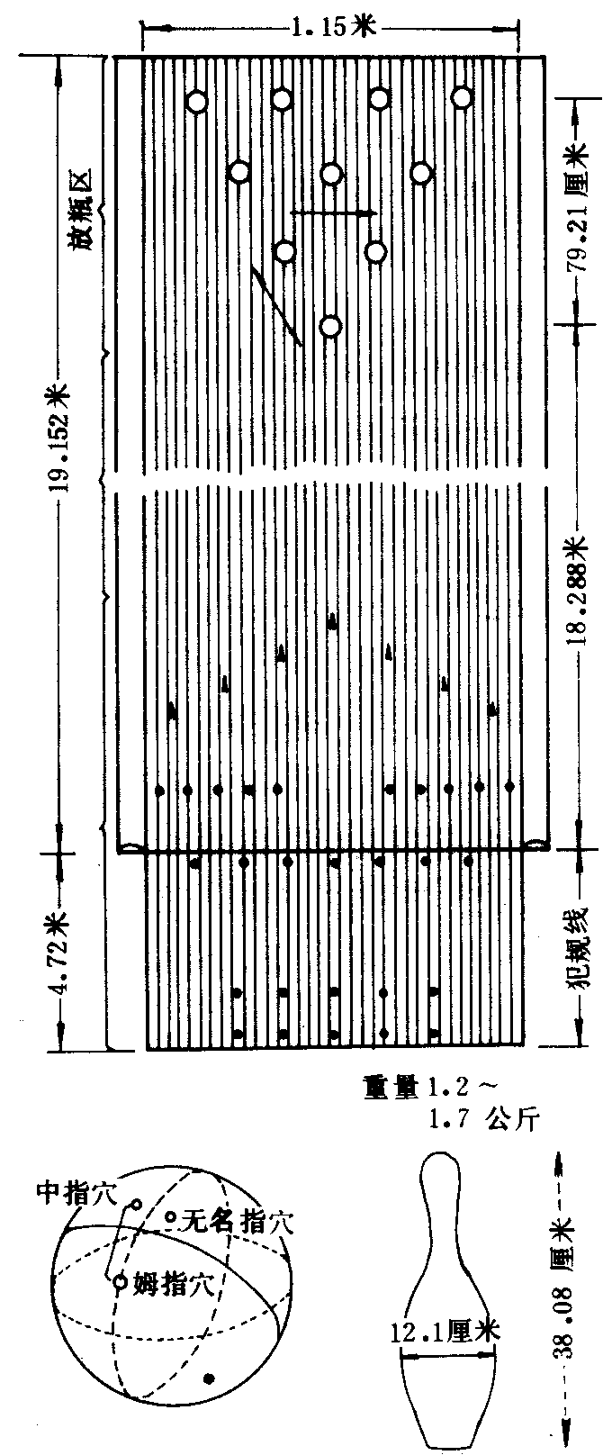 保龄球场保龄球运动比赛场地,主要指球道。正规保龄球道包括边沟、边墙板和助走道。均由木质材料或其他被批准使用的材料构成。另外,放瓶台边缘、后台板、边墙板、平底边沟和边沟侧板都可用纤维或其他合成材料加固。正规球道的长度从犯规线起至后槽(不包括后台板)为19.156m,并允许1.3cm的误差。从1号瓶放瓶中点到后槽的距离为86.8cm。而球道的宽度为104.2~106.7cm之间,加上两侧的边沟总宽度应为152.4~155.6cm之间,其球道表面光滑极平,不得有任何的凹坑,横向倾斜度不得超过40/1000。助跑道为球员走步、滑行及掷球的区域,长度一般为427.3cm,宽度与球道的宽度相同,为104.2~106.7cm。犯规线是指助跑道和球道的连接线,宽为0.95cm。投球区是从犯规线到1号瓶的中心点之间的距离,长为1828.8cm,宽为104.2~106.7cm。发球区道上有两组标识,一组标识是箭头,距犯规线366~488cm不等。这组箭头又叫目标标识点,每隔5块木板有一个箭头,从左向右数,依次分布在第5、10、15、20、25、30、35块木板上,共有7个箭头。另一组标识是小圆点,离犯规线约243.97cm,分为左半组和右半组两组互相对称。这种小圆点叫引导标识。右半组小圆点依次分布在从右向左数第3、5、8、11、14块木板上;左半组小圆点分布在从左向右数同样的位置上。投球时,用目标标识点和引导标识点为基准投球的方式,叫标识点瞄准式。 |
