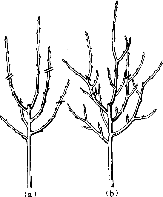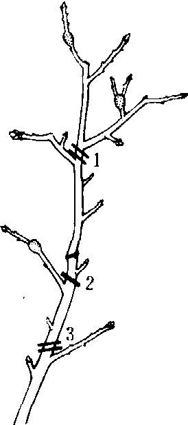 图 3 里芽外蹬 里芽外蹬 短截时, 剪口芽向上或向树中心, 次芽向外侧(图3)。主要用于直立、旺盛的骨干枝延长枝上, 剪口芽萌发后,趋于直立向上,其下萌生枝条, 则向外开张枝角。及至第一个生长季结束, 剪除向上生长的里枝 (连同二年生枝一段)。以第二枝作为向外延伸的骨干枝。直立性强的梨, 苹果的某些品种, 可以连续几年采用,或可将2~3年生直立向上枝段剪除, 选留开张向外枝以代替原来的骨干枝延长枝, 即为利用“背后枝换头”。 大枝锯截 当树冠逐步成长,去除过密大枝时,需用锯截。用于层间大辅养枝或多余的过渡性主枝等。疏除时, 先在枝基部下面锯一伤口, 深约1~2厘米, 然后, 再从枝上方下锯, 可以避免大枝撕裂。锯口应高于枝基0.5~1.0厘米, 近于垂直而有一定坡度, 不使积水, 以利愈合。锯除后, 用刀将锯口削平, 并涂以保护剂。 此外, 还有摘心、除萌、捋枝、撑拉和扭梢等方法(见夏季修剪)。 修剪时期 通常可分休眠期修剪(冬季修剪)和生长期修剪(夏季修剪)。时期不同, 同样的修剪方法,可以得到不同的效果。落叶果树在休眠前, 叶片将大部分非结构性的营养物质回流到枝条、大枝、干、和根部, 最后在枝系和大枝干中贮存, 冬剪时, 养分损失较少,经修剪后,贮藏养分可以集中供应剪口的芽。故修剪影响集中在剪锯口附近; 生长期修剪, 既要剪去已成长的叶片, 又减少了新叶的光合功能, 故修剪削弱树势的作用比较明显。同时, 新梢剪除后, 其下部芽又重生, 延缓了生长期, 打破了顶端优势, 可以促进下部多发芽, 枝条势力得以分散, 故对整体的影响比局部明显, 所以对于苹果、桃等果树的幼旺树, 常辅之以夏剪, 藉以较快地调整其生长与成花的矛盾。 落叶果树从落叶到严冬前,枝梢中营养含量最少。严冬后, 养分开始回升, 严冬时, 伤口不易愈合, 有抽干和冻害的威胁,故不抗寒。髓部大的核果类果树,应在落叶后, 立即修剪, 而耐寒性较强的果树, 如苹果、梨修剪可稍迟; 葡萄和核桃枝条髓部大, 如剪后伤口不能立即愈合, 则容易造成剪口伤流, 故应在刚落叶或展叶时修剪为宜; 柑橘等常绿果树, 冬季不落叶, 修剪宜在冬后、萌芽前进行。广东、广西、台湾等暖地, 修剪宜在采收后, 或刚进入休眠时进行。 修剪对局部是促进、刺激; 对整体则是损失、削弱。修剪的量愈多, 修剪的程度愈重, 则刺激作用愈强, 对整体的削弱愈重。在实践中, 每年的修剪量应力求减少,只作必要的剪截, 避免大杀大砍; 其次,修剪的效应是一个渐变的过程, 旺树、旺枝需经2~3年缓剪, 才能缓和或转弱; 从留枝数量, 也是一个由少到多, 进而过密的趋势。因此, 修剪方法, 修剪程度的选定要慎重,一经选定不要轻易变换, 持续过程中,则又应因树势变化而稍有变动; 其三, 修剪的调节作用必须与土、肥、水其他管理措施密切配合, 还应考虑到外界环境条件的差异,才能充分发挥修剪的作用。 修剪技术曾日趋复杂和精细, 甚至趋于繁琐。为了加速普及, 节约用工, 目前, 欧美等国趋向于在预定树冠的基础上, 采用维持树形的机械化修剪, 但不适合果树生物学特性,不能充分发挥果树的生产潜力,故必要时, 辅之以人工。中国则以人工为主, 冬夏结合, 加速造形, 适当轻剪, 注意更新, 以整体平衡为主, 简化树体结构, 不再强调小枝和枝组的修剪, 而求得简而易行, 提高效益。 修剪果树管理技术措施之一。以修枝剪和手锯为主要工具,对果树的各类枝条进行短截、疏剪、除芽、除萌、扭伤、圈枝、环割等,以调节生长与结果的关系,达到年年高产的目的。 修剪pruning树体管理中的一项重要技术措施。应用短截、疏剪、抹芽、摘心、刻伤、环剥、曲枝、扭梢等具体技术,以调节树体的生长发育,维持和发展既定树形、树姿及树体大小,改善冠内光照条件和转化枝类组成。通过修剪,可平衡树势,更新复壮树体,提高果树的产量和果实品质,或提高树木的观赏价值。按修剪时期分为冬季修剪和夏季修剪。也有的将断根称为根系修剪,将应用植物生长调节剂调控枝梢生长称为化学修剪。 |