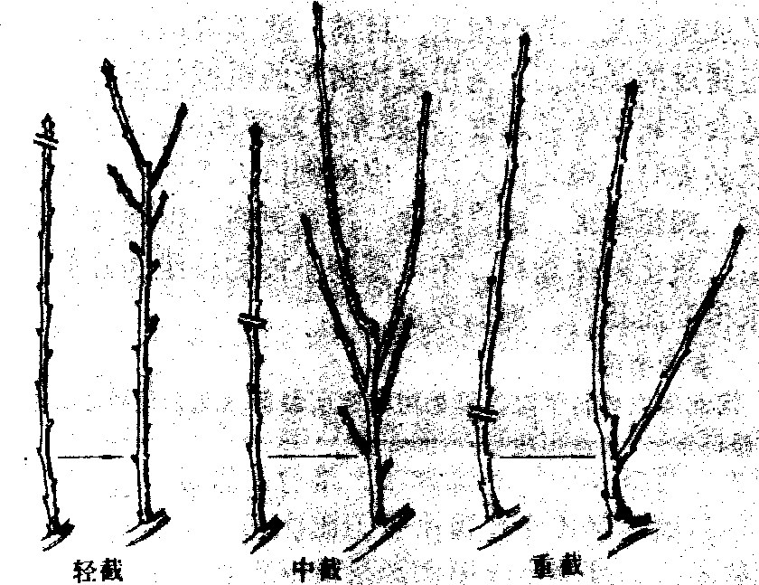 图 1 短 截 短截 剪去枝条的一部分(图1)。枝条经短截后,可以增强剪口芽的生长势。轻短截对原枝条的刺激较小,剪口芽不会发生强旺枝, 但下部芽受抑较轻, 萌发较多。一般在培养中小型枝组, 或希望减缓生长势时采用; 中短截的剪口芽为饱满芽, 能促发长枝, 和少量中短枝, 一般对骨干枝的延长枝, 中、大型枝组的带头枝, 以及希望填补空间时采用; 重短截常能促发几个旺枝或徒长枝, 使局部生长势得以加强, 这种效应与增施氮肥相似。因此, 仅在控制枝组或平衡树势时采用。重短截虽然能促生强旺枝, 但由于被剪去的枝段也较长, 树冠相对被缩小, 枝条中贮存的营养也有所损失, 所以对植株的整体是一种削弱。对幼树和壮树重短截愈多, 对剪口芽的促进愈明显, 但对全树总生长量、总叶量则愈减少。对整个树势的削弱也明显; 对老弱树适当重剪, 则由于增加了根/冠比,使贮藏营养集中使用,反可以促进新梢萌发, 树势复壮。 疏剪 又称疏枝, 是把一年生枝或多年生枝从其基部剪除。疏除上部枝条, 其顶端优势就转移到下部的枝条, 增强生长势; 如疏除的枝条处于下部, 疏除时的伤口对其上部的枝条, 则是一种损伤和阻力, 对上部的枝势起减缓作用。疏除强枝可以减少竞争、缓和生长与结实的矛盾, 疏除弱枝,则可以集中营养,有助于留存枝、芽的复壮更新和提高成花坐果能力。疏剪也用在减少一树的枝量, 或使枝叶过密部分改善风光条件, 而不致影响对局部的重大刺激。 长放 又称甩放、缓放。即放任枝条自然生长。长放的枝条顶端, 生长势逐年削弱。分枝多而短, 有利于缓和树势, 增加积累, 促进成花。幼旺树, 适当甩放一部分拉平的长枝、壮枝,有利于提早成花结实。直立枝长放, 则由于叶面积多, 顶端优势强, 反而会促使枝茎加粗快, 生长继续过旺, 故长放应结合拉枝。缩剪 又称回缩(图2)。常用于骨干枝的换头或结果枝组的更新。缩剪的反应与剪截口大小, 剪截量的多少和截留枝芽的质量有关, 缩剪旺枝, 对剪口刺激重, 应在剪口留有一定量的发育枝,以分散其势力, 达到缓和的目的, 一般用于层间大的辅养枝上; 缩剪弱枝, 则对后部有良好的复壮作用, 通常用于衰弱的结果枝组。 ![]() 图 2 缩 剪1. 轻缩剪; 2. 中缩剪 刻伤 又称目伤。在枝条萌芽前,于芽的上方约2~3. 重缩剪3毫米处,横刻一刀, 深及木质部, 由于伤口刺激和养分截留, 可以迫使该芽萌发, 在希望补空时使用。在芽上涂BA(苄腺嘌呤)发枝素, 也有类似的效应。
