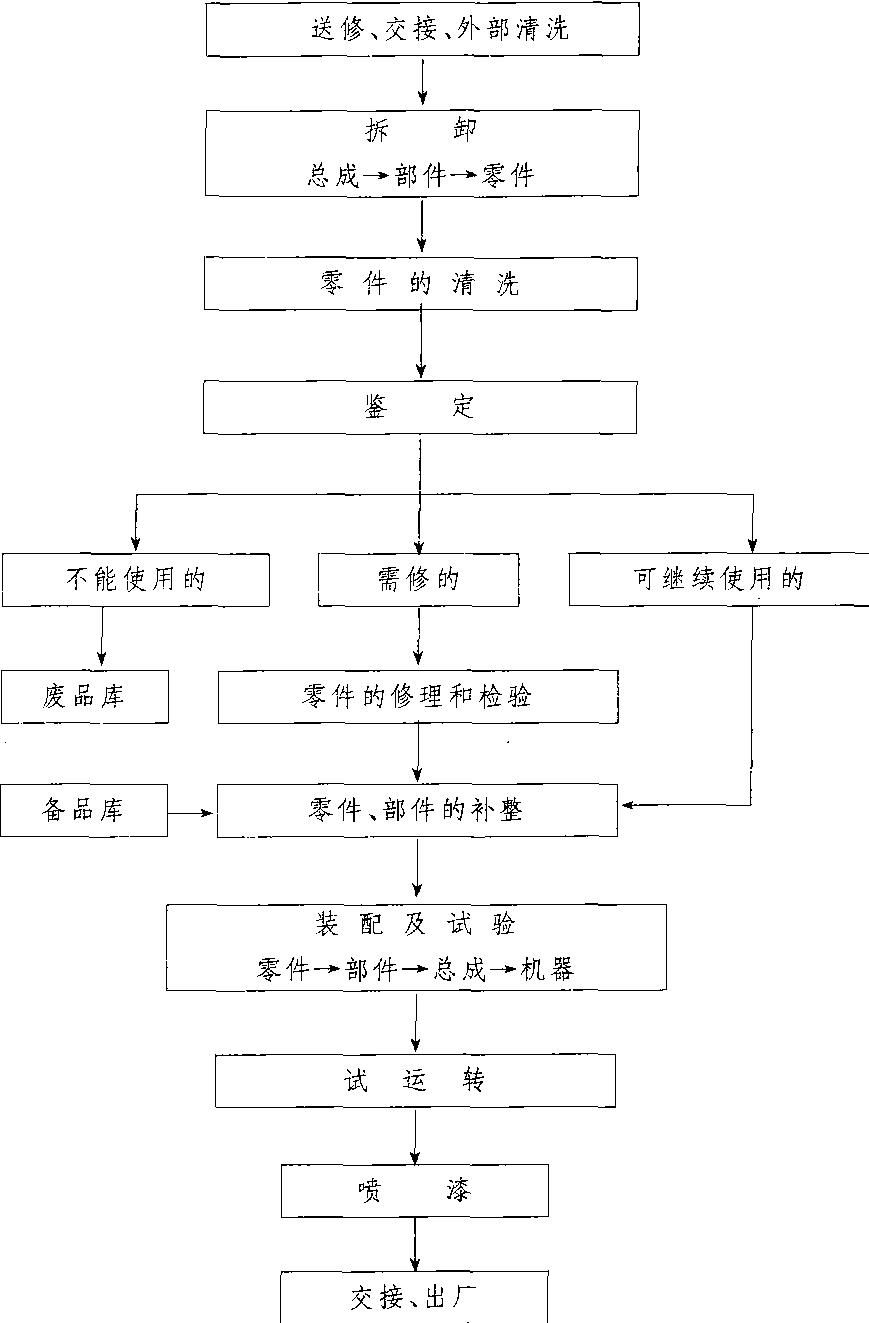 机器从修理开始至完成的全过程中,各作业工艺按先后顺序流动的组合方式,并按框图表示。目的在于指导和管理机器修理工作。机器修理一般工艺流程如下。