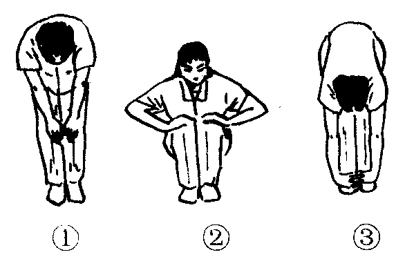 练功十八法第3套第3节。动作过程:两脚并立。❶上体前屈,两手扶于膝关节,膝盖绷直。(图2—4—135—❶)❷屈膝下蹲,两手仍扶于膝上。(图2—4—135—❷)❸两掌先贴脚背后,再伸直两腿。(图2—4—135—❸)❹还原成预备姿势。共做2~4个8拍。注意事项:练习时要手掌先贴脚背后再伸直两腿。此功法对髋、膝关节及下肢屈伸困难者有较好的疗效。