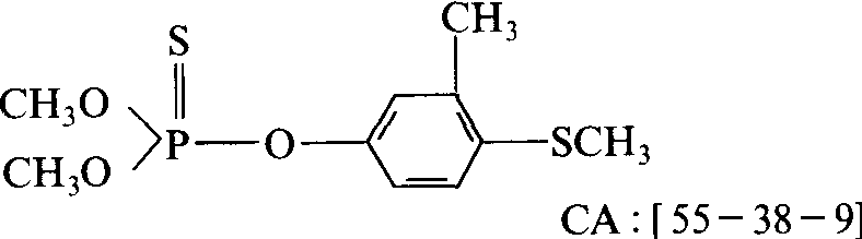 | 释义 | 倍硫磷fenthion低毒硫逐式一硫代磷酸酯类杀虫杀螨剂。化学结构式: