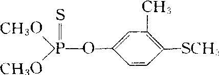 性能 纯品为无色无臭油状液体,对光照、加热、微碱性介质均较稳定。难溶于水,20℃时溶解度54~56毫克/升,易溶于大多数有机溶剂。对高等动物较低毒,大白鼠急性口服LD50 245~615毫克/千克(雌),190~315毫克/千克(雄);急性经皮LD50 330~500毫克/千克。对鱼类低毒,但对蜜蜂、禽类毒性较高。对害虫具有触杀和胃毒作用,叶面施药有内渗作用。挥发性低,持效期长。在植物体内可氧化为相应的亚砜和砜化合物,从而提高对害虫的毒力。 应用 主要以乳油对水喷雾,用于防治大豆、棉花、果树、蔬菜、水稻等作物上的鳞翅目幼虫、蚜虫、叶蝉、飞虱、蓟马、果实蝇、潜叶蝇及一些介壳虫。对叶螨类有一定药效。也可用于防治蚊、蝇、臭虫、虱子、蜚蠊等卫生害虫,特别适合用于防治孑孓。收获前禁用期水稻为14天。一般使用下无药害,但十字花科蔬菜的幼苗、梨树、樱桃、山楂、啤酒花及某些品种的苹果、棉花较敏感,慎用较高浓度药液。 倍硫磷fenthion又称Baycid、Lebacid、Mercap-tophos、S-1752。广谱性、特效期较长的有机磷杀虫剂。化学名称:O,O-二甲基-O-(3-甲基-4-甲硫基苯基)硫代磷酸酯。化学结构式如下。无色油状液体,密度1.245/20℃,熔点7.5℃,沸点105℃/13.3 Pa,20℃时蒸气压3.7×10-6 mPa,其折射率(n20d)1.5698,温水中溶解度为54~56mg/L。易溶于大多数有机溶剂。对大鼠口服毒性(♂)LD50为190~315 mg/kg,(♀)LD50为245~615 mg/kg。经皮毒性大鼠LD50为330~500 mg/kg。防治水稻二化螟、三化螟、稻飞虱,棉花红铃虫、棉铃虫、桃小食心虫、大豆食心虫。在水稻上使用时安全间隔期不少于14天,在土壤中可迅速被降解。