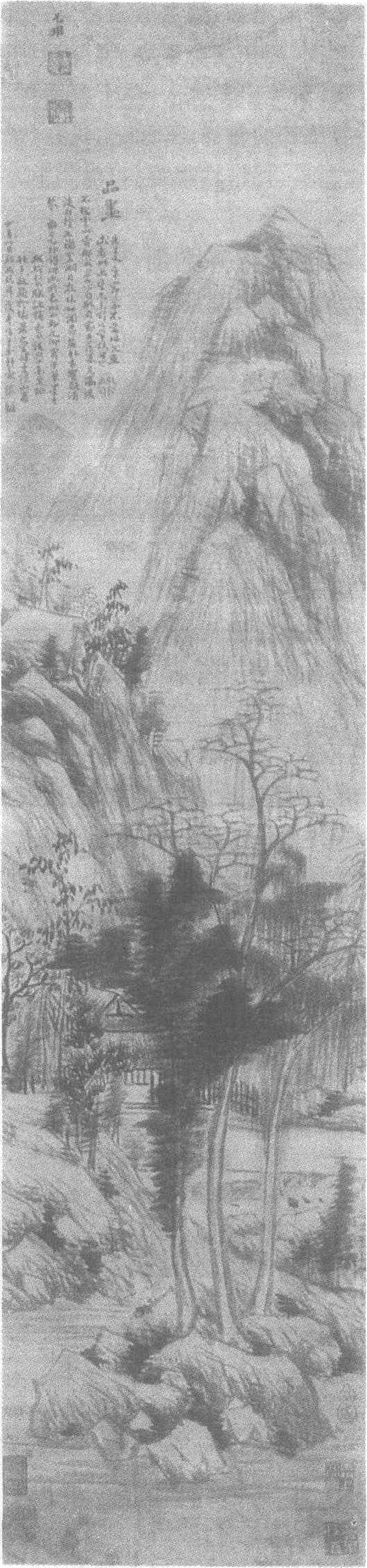 | 释义 | 倪元璐山水图轴明。倪元璐绘。洒金笺墨笔。纵125.7厘米,横30.4厘米。上海博物馆藏。倪元路(公元1593—1644年),字汝玉(一作玉汝),号鸿宝园客,浙江上虞人。天启二年(公元1622年)进士,官至户、礼两部尚书,翰林院学士。李自成进京后自缢死,谥文正。工诗文、书法,擅山水、竹石。所画山水,笔墨秀逸清润。一般喜用大、小斧劈皴,气势雄浑,风格古拙。所作竹石喜用水墨生晕之法,自具风格,以意见长。著有《倪文贞集》。传世作品有《山水花卉图册》、《山水图轴》、《湖山放棹图扇面》等。此幅是讲究笔墨情趣的典型的文人画作:峰峦峻拔高耸、逶迤起伏,河石堆磊坡下,皆以长线条作皴,笔笔中锋,柔中带刚。挺劲不阿的树木疏茂交错,各种树叶用横直墨点,层次丰富,浓淡相宜。山和树之间,坡堤平坦,水流涓涓,屋舍篱笆或隐或现。图的右上角署款“元璐”钤白文〈倪元璐印〉、〈鸿宝氏〉二方印。图上还有清代画家高凤翰于雍正乙未年作的题跋。此图笔墨简括,燥润自然,线条率略,逸气飞动,于看似杂乱无章的笔势中蕴含着隽永的韵味。