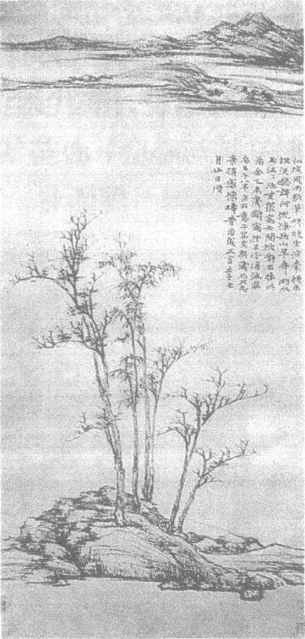 | 释义 | 倪瓒《渔庄秋霁图》立轴,纸本,水墨。此卷描绘的是江南渔村秋景。一片平远开阔的景象。近处坡石上,五六株高枝秀劲挺拔,枝叶疏整,四面生枝。远景群山起伏映带,横于波际。中景为湖光波色,一片空明,更映衬出前景高树的风姿。此图明显的 “三段式”构图是倪瓒山水的特征之一。画中山石用长披麻皴,在转折处打上苔点,结构紧凑而笔墨苍润。树木枝干参差错落,疏密有致,枝叶较少,墨色浓淡错综,浑厚滋润。树头以雀爪和点笔,萧森一片,映以大片湖波清明平静,更增了画面雨后初晴、秋高气爽的意味。画名虽为“渔庄秋霁”,而画中却不见渔庄村舍。然而那疏朗的构图,润泽的笔墨,却使观者仿佛置身于江南渔庄初霁的清新、潇逸的景致中。