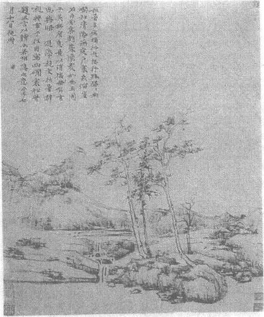 | 释义 | 倪瓒幽涧寒松图轴元。倪瓒(见《倪瓒渔庄秋霁图轴》条目)绘。纸本墨笔。纵59.7厘米,横50.4厘米。北京故宫博物院藏。图中缓坡绵展,远接青山。山脚一汪清泉层叠而下,注入坡前幽静的湖水之中。水边乱石散落,几株寒树聚立坡头。枝干细瘦,松针稀疏,乔木上的枯叶脱落殆尽。此图笔法松动,墨色浅淡。山峦坡石以干笔侧锋皴擦,再用淡墨略作渲染,浑蒙萧散,韵致深远。树木用中锋细笔写形,又以浓墨点叶、圈疤、勾画松针,清简疏秀,风姿绰约。幅中自题五言诗一首:“秋暑多病渴,征夫怨行路。瑟瑟幽涧松,清荫满庭户。寒泉溜崖石,白云集朝暮。怀哉如金玉,周子美无度。息景以逍遥,笑言思与晤。”款署:“逊学亲友,秋暑辞亲,将事于后,因写幽涧寒松并题五言以赠,亦若招隐之意云耳。七月十八日,倪瓒。”诗题意在劝说友人息罢仕宦之思,归隐自然。诗画一体,有一种超世脱俗的神韵,表现了画家旷达简放的人生理想。此图曾经清人宋荦及清内府收藏。《清河书画舫》、《石渠宝笈初编》著录。