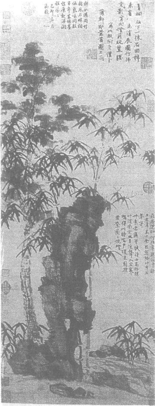 | 释义 | 倪瓒梧竹秀石图轴元。倪瓒(见《倪瓒渔庄秋霁图轴》条目)绘。纸本墨笔。纵96厘米,横36厘米。北京故宫博物院藏。图中平坡之上挺立一块湖石,高拔坚劲,姿形秀逸。石后映带两竿修竹及一株梧桐,竹枝弄影,新叶披纷,错落有致,层次分明。梧桐孤立于后,萧淡苍润,树色朦胧。此图以浓墨勾染近处的竹叶与湖石,远竹则以淡墨描绘,竹后的梧桐又以飞白写干,泼墨涂叶。笔法简放,墨色淋漓,画意清新爽利,别具一格,表现了倪瓒作品中温润的一面,图中画家自题:“贞居道师将往常熟山访王君章高士,余因写梧竹秀石奉寄仲素孝廉,并赋诗云:‘高梧疏竹溪南宅,五月溪声入座寒,想得此时窗户暖,果园扑栗紫团团。’倪瓒。”图中有贞居道师张雨的题诗。此图曾经清人梁清标、安岐及清内府收藏。《式古堂书画汇考》、 《大观录》、《墨缘汇观》著录。