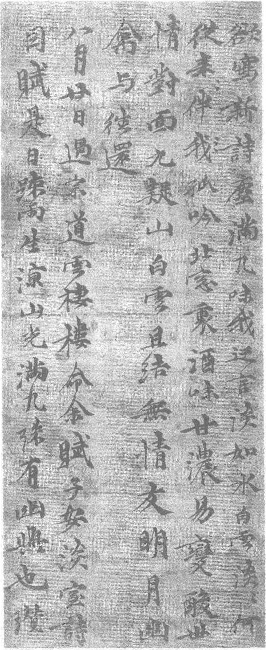 | 释义 | 倪瓒行楷书淡室诗元。纸本。纵64厘米,横27厘米。北京故宫博物院藏。倪瓒(元大德五年—明洪武七年,即公元1301—1374年),初名珽,字元镇,号云林、幻霞子、荆蛮民、净名居士等。无锡(今江苏无锡)人。一生不仕,筑清閟阁,富蓄古书画秘籍,喜与名士交往。工诗,善画山水,自成一体,为“元四家”之一。亦擅书法,徐渭评:“瓒书从隶入,辄在钟繇《荐季直表》中夺舍投胎,古而媚,密而疏。”此幅作品,是倪瓒为友人宗道所作,行楷书,从古隶入,融于己法,形成冷逸荒率、天然古淡的独特风格,与其画风相表里,是其代表作品。