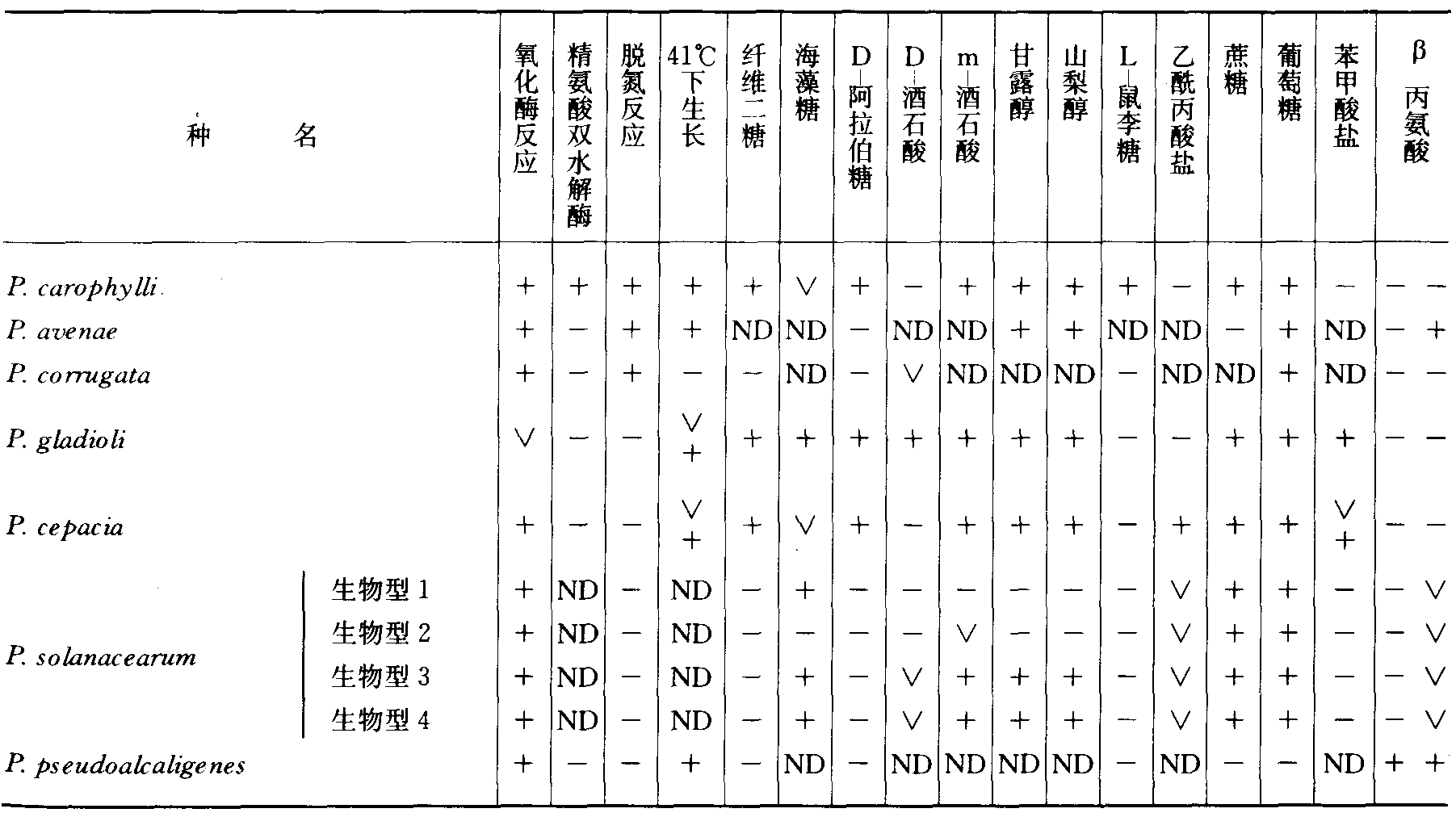 | 种 名 | β 丙 氨 酸 | 苯 甲 酸 | m- 酒 石 酸 | D- 酒 石 酸 | 香 茅 醇 | 山 梨 醇 | 2- 酮 基 葡 萄 糖 酸 | 纤 维 二 糖 | 海 藻 糖 | 蔗 糖 | 葡 萄 糖 | 金 氏 A 培 养 基 产 绿 脓 素 | 41℃ 下 生 长 | 明 胶 水 解 | 硝 酸 盐 还 原 | 烟 草 过 敏 反 应 | 马 铃 薯 软 腐 | 果 聚 糖 产 生 | 精 氨 酸 双 水 解 酶 | 氧 化 酶 反 应 |