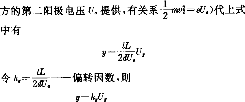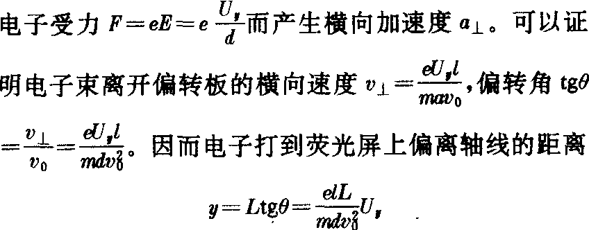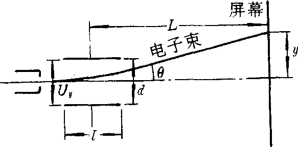 电子以v0沿轴线水平进入垂直偏转电极,偏转电极为两平行平板,板间距离d远小于板的线度l,设板间电压为Uy,忽略边缘效应可视两板间为匀强电场 ![]() ![]() 若用第二阳极电压Ua(一般电子束速度v0由偏转板前 ![]() 即荧光屏上电子打击的光点的位移y正比于加在偏转板上的电压Uy。若Uy=Umsinωt,则 y=hyUmsinωt 荧光屏上光点随偏转电压正弦变化。 |