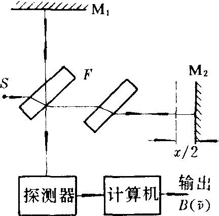 | 释义 | 傅里叶变换分光计fuliye bianhuan fenguangji利用干涉谱与傅里叶变换技术相结合测定光谱的精密仪器。干涉谱是用迈克耳孙双光束干涉仪获得的。在下面的原理图中,入射光束被半反半透膜F分为两束。一束射向固定反射镜M1;另一束射向可移动反射镜M2。M2移动x/2,则光程差变化x。这两束光在出射光束中相遇,发生干涉。这时,探测器接收到的是一种调制信号I(x),它是x的函数,同入射光谱的强度分布B(ῦ)之间的关系是