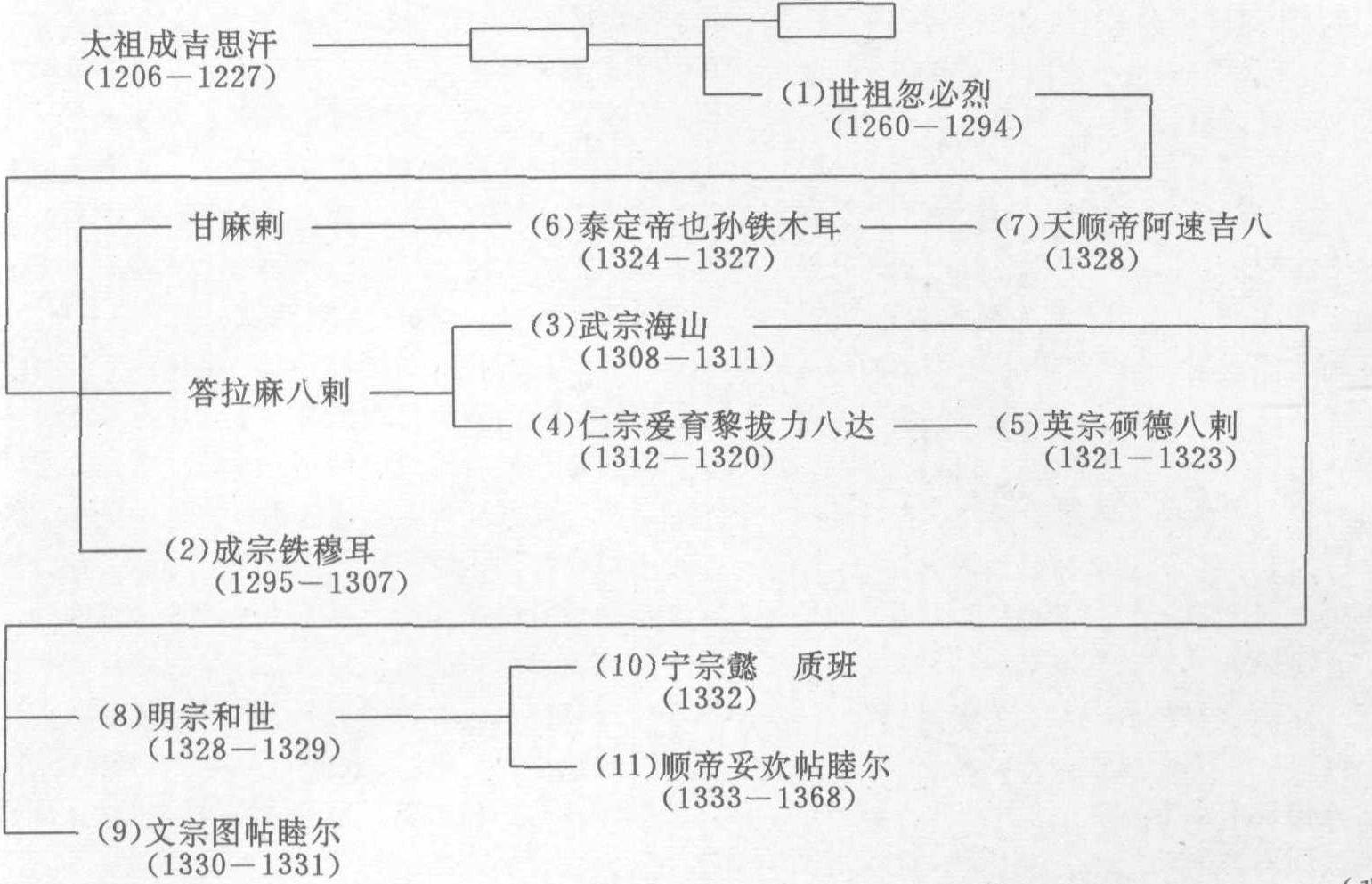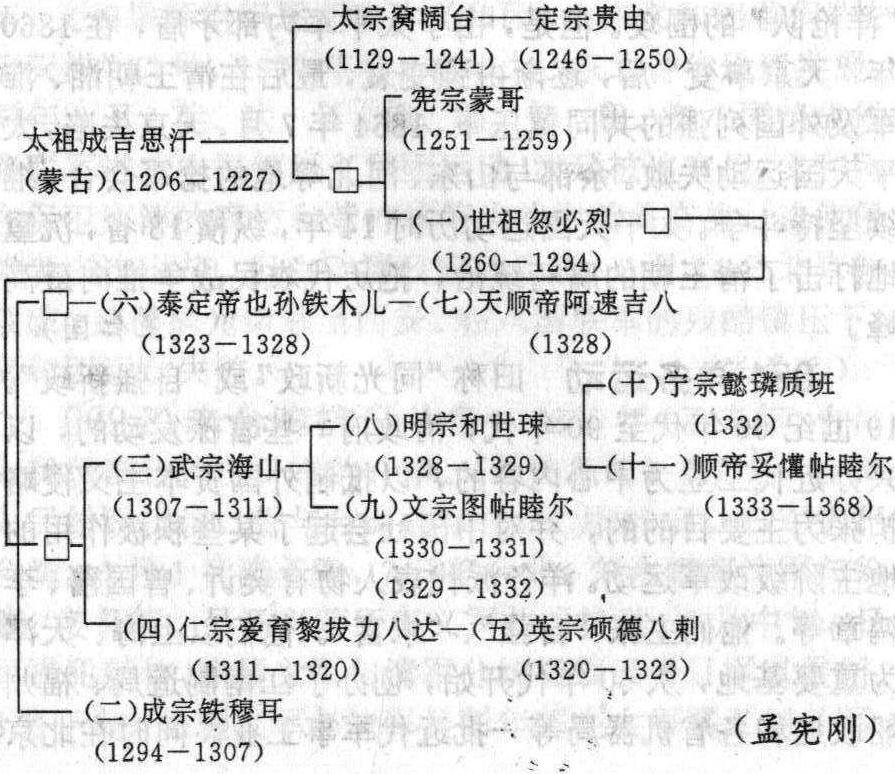 | 释义 | 047 元1271—1368蒙古族建立的政权。1206年蒙古族的杰出首领成吉思汗建立蒙古汉国,国势日益强大,先后灭掉西辽、西夏、金、大理,统治势力达到吐蕃。1271年忽必烈汗改国号为元,定都大都 (今北京),1279年灭南宋,统一全国。疆域东起大海,西到今新疆,南起大海,北至外兴安岭贝加尔湖,西南包括云南、西藏,东北达鄂霍次克海。1351年爆发农民大起义。1368年朱元璋的明军攻陷大都,推翻了元朝统治。自元世祖忽必烈改国号为元至顺帝,传11帝,历98年。 蒙 古 及 元 世 系 表