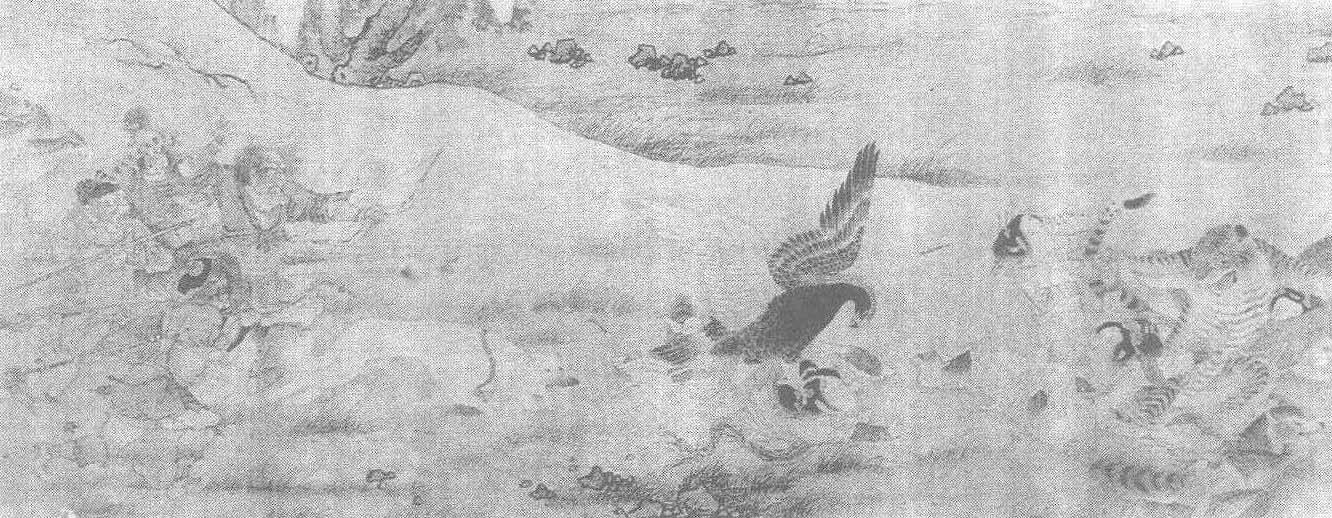 | 释义 | 元人搜山图卷(2件)元。佚名。绢本设色。纵53.4厘米。横533.4厘米。北京故宫博物院藏。此图根据我国西南地区的民间传说,描绘二郎神率领天兵神将搜山降魔的故事。其内容情节有一个较为复杂的发展过程。关于二郎神历来存在着不同的说法,最早的一种可能是从秦时蜀郡太守李冰兴修都江堰水利工程的史实衍生出来的。“二郎神”一名始见于唐代,其原型是李冰的次子,以后又被指为隋代嘉州太守赵昱、北宋徽宗宠宦杨戬等。其传说内容也由变牛斗江神转化为入水斩蛟龙,再补入搜山降魔怪。元时还出现过反映二郎神搜山内容的武打杂剧《二郎神醉射锁魔镜》,讲述二郎神与哪吒比武,带醉射破了驱邪院主的锁魔镜,放走了被镇锁住的金睛百眼鬼和九首牛魔王,因此引出了二郎神与哪吒赶到黑风洞,搜山追回二洞妖魔的一段故事。而此图在内容、形式上又与前者有所不同,它并不停留在武将间的战斗场面,而着意描绘了二郎神手下的兵将对山精草怪大规模剿捕虐杀的情景。对比其他稿本的搜山图卷可知,此图为一残卷,是全图的后半部分。画面从左向右展开,山野峦冈之上,怪石嶙峋,古木苍苍,狂风疾吹,枯叶漫天飞扬,一副萧杀之气。树下两条巨蟒被一个赤发鬼卒逼得无路可逃,张开大口,返身迎敌。旁边另一个鬼卒挥剑紧追一只怀抱女妖张惶逃窜的猪怪,画面上方,一神从树上揪下一个猿精,挥棒欲打。他们身后,几名神将或架鹰,或纵犬,或挥刀放箭,正在追杀一群妖兽。落在最后面的一个女妖已被一只巨大的苍鹰扑倒,鹰爪深入发际,女妖额头鲜血涔涔,面目美艳而神色凄婉,痛不可支。前面,熊、虎、蛇、蜴、狐、兔诸怪正急忙忙逃向一处山岩。兽群中,四个女妖在突然而来的打击之下,惊慌失措,一时来不及现还原形,衩裙裹步,力不从心。虎妖在惶急中张开两爪,拖着她们奔跑,但仍有两个女妖中箭倒地,一妖裙下还露出一双猿脚。而那些身轻足健的妖兽,命运同样可悲。在它们前面的山洞中突然冒出四个早已埋伏在那里的神将。跑在头里的山羊被槊刺中前胸,惨叫一声,倒地身亡。其他野兽一时间惊住了,不知如何是好。山岩的另一端,鬼卒们正在放火烧洞,一鬼架柴,一鬼扇火,其他鬼卒则把住各个洞口准备捕杀。火舌直贯洞中,一只红衣小猿被热流逼到洞口,准备冒死出逃。一群鬼卒带着他们的俘虏从山坳中走出,有的扛鹿,有的缚猿,有的驱赶女妖,有的拖曳树精。前面一个蛇身女妖抱树回顾,面色惶惧。画面至此终止,但故事似乎并未最后完结。此图人物均以细笔描绘,重彩着色。主要采用铁线描及游丝描。铁线作衣纹,刚劲有力,游丝勾手脸,形神兼妙。山石树木挺拔峻峭、奔放豪纵,有马远、夏圭之遗风。构思新奇,笔法严密,叹为神工。卷后有“苏汉臣制”四字伪款,《西清札记》著录。《搜山图》一类的绘画作品流行于两宋、元、明初。画史记载画家高益曾作《鬼神搜山图》,并因此得到宋神宗的赏识而任为图画院待诏。高益可能是《搜神图》的始发端绪者。今传《搜山图》有好几种稿本,有宋人白描纸本,亦有后人的绢本设色长卷。其中艺术水平最高的是这本元初创作的设色长卷。而内容最为完整的则是云南省博物馆收藏的明摹本《搜山图卷》。滇博此卷为绢本设色。纵44.3厘米,横606厘米。无款识、收藏印及题跋。全图以二郎神为中心,描绘天兵神将的捕猎妖兽场面,二郎神美髯凤目,头戴缨盔,身着铠甲,体魄魁伟,手持宝剑,坐在由三个鬼卒组成座墩之上,颔首倾听一位神将报告战果。主神周围聚立着众多的兵将,大多面相凶恶诡异,或青面獠牙,或赤发尖喙,他们有的擎刀,有的托印,有的抱剑铗,有的捧书册。有的举青镜,有的掌旗帜,森然林立,各司其职,人形神将仅一两位。图左五个鬼卒在一位神将的指挥下正从山洞里向外拖拽一条巨蟒,蟒的前半身仍在洞中苦苦撑拒。忽然“叭”的一声,蟒身断为两截,两个兵卒由于用力过猛,猝不及防,一个仰面翻倒,一个倒栽于地。另有六个神卒拖着狗,扛着猪,绳缚牛颈,手扳鹿角,强拽着这些妖兽来见主神。二郎神的脚前锁着一头黑熊。可怜巴巴地等待发落,而它后面的一只猛虎,虽然被两个神将牢牢按住,但仍然翘尾咆哮,挣扎不已。另一条被木杈叉住的细蛇,尾部已被神兵拉直,迎头又受到神火的灼烤,也依旧奋然反噬,毫无惧色。它们身后的两个女妖被神兵驱赶着,怀中各抱一个小猴,疲惫恐慌,则又是一种心境。画卷的后部与故宫藏本内容基本相同。两图可能出于同一幅宋本旧稿。在整幅《搜山图》中天兵神将多为恶鬼之形,状貌凶陋,手段残忍,无法使人对他们产生好感。而妖兽们造型准确,表情悲凄,那种身处危难,惊惧畏怖之余犹然长幼扶护、生死相依的情状震憾人心,更能引发出读画者对它们悲惨命运的深切同情。因此《搜山图》还另有重要的社会意义和强烈的思想内容而待进一步探讨。