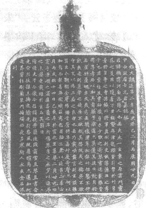 | 释义 | 元显雋龟形墓志北魏延昌二年(公元513年)。长71.5厘米,宽50.3厘米,高38厘米。1918年河南省洛阳市北朝墓出土。江苏省南京博物院藏。墓志为龟形,有盖,盖题“魏故处士元君墓志”八字。楷书志文19行,刻于龟背甲上,起首为“维大魏延昌二年岁次癸巳二月丙辰朔廿九日甲申故处士元君墓志铭”。此志石造形生动有趣,笔法清晰工整,颇受各家重视,但亦有人疑为伪作。《芒洛冢墓遗文》、《九钟精舍金石跋尾乙编》、《汉魏南北朝墓志集释》均有此志石著录。