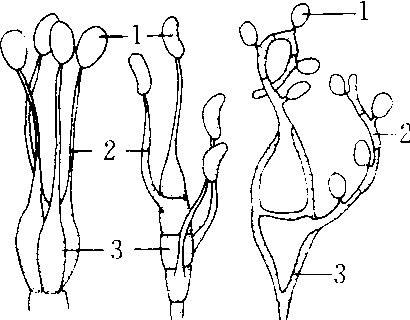 担子类型及先菌丝 1.担孢子 2. 先菌丝(上担子) 3.冬孢子(下担子) |