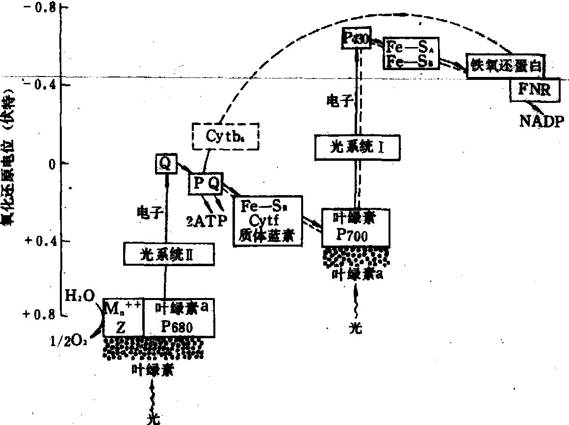 光合磷酸化的实质是由于光反应所产生的化学势超过了水的氧化与铁氧还蛋白的还原所需的化学势,其中部分能量用于形成ATP。非环式光合磷酸化总的反应如下: