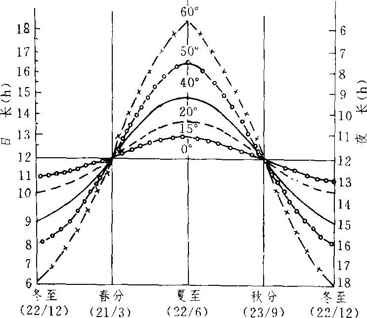 北半球不同纬度地区昼夜长度的季节性变化(北京约在北纬40°) |