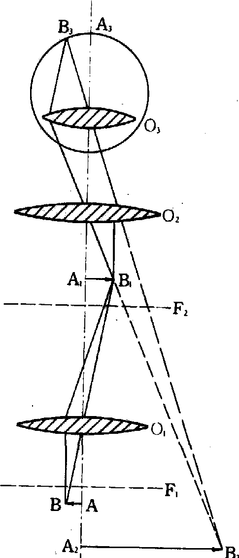 光学原理 即透镜的成像原理。物镜和目镜的结构虽然复杂,但二者均相当于一块凸透镜。将被检物AB放在物镜(O1)的前焦面(F1)之外,则在物镜上方形成一个倒立的放大实像A1B1,正好在目镜(O2)的焦面(F2)之内; 目镜(O2) 再对A1B1进一步放大而形成虚像A2B2;当眼睛在目镜上方观察时,A2B2通过眼睛的晶状体(O3)映在后方的视网膜上形成A3B3,最终使人感知显微镜放大物像的存在 (图2)。 分辨力 又称分辨率或分辨本领。指显微镜能把两物点分开的最小距离(分辨距离)的能力。分辨距离越小,分辨力越强。分辨距离(d)与照明光的波长(λ)和物镜的镜口率(NA)的关系可用公式d=0.61λ/NA表示。若取可见光平均波长550nm为照明光波长,并使用镜口率为1.25的油镜,则其分辨距离为270nm。此值为普通光学显微镜的最大分辨力,约等于照明光波长的一半。若用可见光中波长最短的紫色光(波长约为400nm)作为照明光,则分辨距离约为200nm,此值为普通光学显微镜的分辨极一限。 放大率 也称放大倍数。在标准光学筒长条件下,显微镜总放大率等于目镜和物镜放大倍数的乘积。总放大率可随光学筒长的增加和目镜放大倍数的提高而增加。但由于分辨率由照明光波长和物镜镜口率所决定,靠提高光学筒长和目镜放大倍数并不能提高显微镜的分辨率。一般有效放大率的上限是物镜的镜口率乘以1000,下限乘以250。根据这个范围,使用一种物镜,要选择与其相适应的目镜,以保证显微镜的有效放大率。如果单方面提高目镜的放大倍数超过了有效放大率的上限,即造成无效放大,不但无用,反而会降低物像的清晰度; 如果降低目镜放大倍数,使总放大率低于有效放大率下限,就无法充分利用物镜的分辨本领,使显微镜的分辨率降低。例如,根据理论和技术极限,浸润系物镜最高镜口率为1.40,而干燥系最高镜口率为0.95,故光学显微镜的有效放大倍率的上限干燥系物镜为950×,浸润系物镜为1 400×,若用镜口率为0.95、放大60×的物镜时,配用的目镜不得超过15×(15×60=900×);若用镜口率为1.40、放大100×的油镜时,所配用的目镜以不超过14×为宜(14×100=1400×)。 清晰度 指显微镜造成物像轮廓明显与否的能力,主要取决于物镜。影响物像清晰度的因素较多,如不同色光可以造成色差、透镜本身可以造成像差、盖玻片过厚过薄、镜口率和光学筒长不合标准等都能影响物像清晰度。 应用 用于观察标本的微细形态结构,从而获得肉眼不能分辨的物体细节,如观察细胞和组织的形态结构等。生物体有的可以直接置于显微镜下观察,如观察原生动物或多细胞生物分散细胞的形态和生命活动; 也可以做成合乎一定要求的标本如切片、涂片、铺片和撕片,经过染色,然后借助于显微镜进行观察;还可以结合其他学科的专门技术如细胞和组织化学技术等,对被检物作特殊处理,以便研究其化学成分及机能。在动物学、植物学、微生物学、细胞学、组织学、胚胎学、遗传学及其他凡是需要研究显微形态结构的领域,都离不开显微镜。 光学显微镜一类光学仪器。以可见光为光源,用玻璃制作透镜的显微镜。常见的有单式显微镜与复式显微镜两类。前者构造简单,放大倍数在10倍以下。构造稍复杂的单式显微镜为解剖显微镜,其放大倍数在200倍以下。它们放大的物象都是方向一致的虚象,即直立的虚象。复式显微镜结构较复杂,放大倍数可达1250倍,最高分辨力为0.2微米。如普通生物显微镜、暗视野显微镜、相差显微镜、荧光显微镜等。 光学显微镜light microscope用可见光作光源对肉眼难于分辨的微小物体进行放大观察的光学仪器。由光学部分和机械部分组成。光学部分有反光镜、聚光镜、物镜、目镜及镜筒组成透镜系统;机械部分有镜架、载物台和各种调节装置。有的附有光源装置和照像系统。透镜系统的质量是决定光学显微镜的分辨能力、放大倍数、成像的清晰度和色差的纠正能力。一般光学显微镜的极限分辨限度为0.2 μm,比人眼高1 000倍。生物体有的可直接在显微镜下观察;有的需要做成合乎一定要求的标本,如切片、涂片、铺片和撕片,或经过染色,才能进行观察。还可以结合其他技术,如组织化学技术等,对被检物作特殊处理,以研究其化学成分及机能。 |