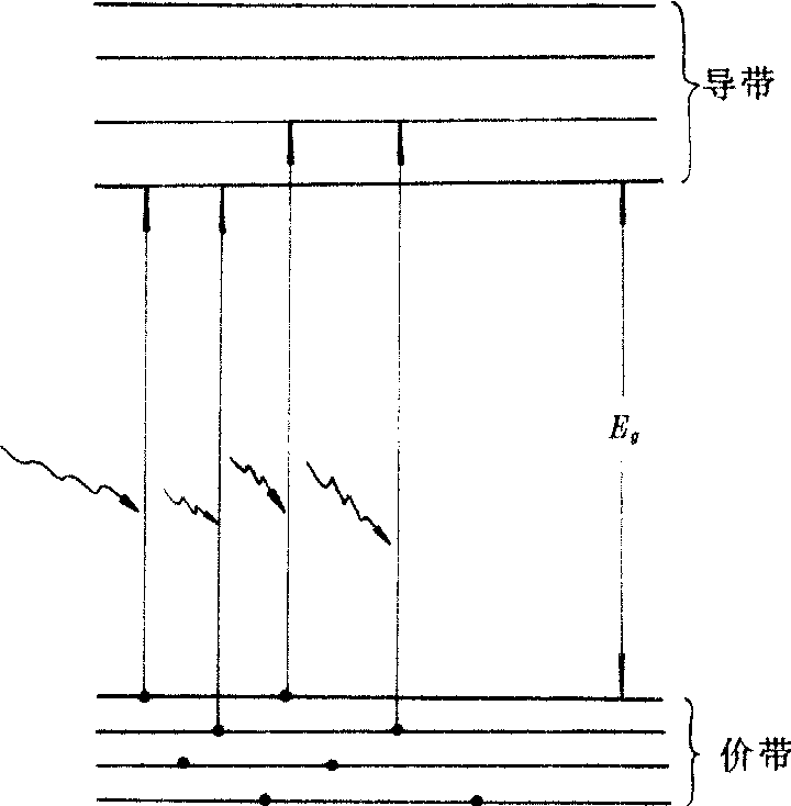 | 释义 | 光电导guandiandao固体受光照而引起电导率改变的现象。虽然绝缘体和半导体都有这种效应,但光电导这一概念通常是对于半导体而言的。电导率正比于固体内的载流子浓度,凡是能引起载流子浓度增加的光照都会产生光电导。当入射光子的能量大于晶体的禁带宽度并等于一定值时,晶体价带中的束缚电子吸收一个光子能量而跃迁到导带,产生电子——空穴时,结果在导带中增加一个传导电子,在价带中增加一个空穴。这样就同时增加电子和空穴浓度。这一过程引起的光电导称为本征光电导。也存在这样的情况,当入射光子的能量足够大时,电子的跃迁可以发生在禁带中的杂质能级与某一能带之间。如果电子从杂质能级跃迁到导带,则只增加导带内的传导电子浓度,如果电子从价带跃迁到杂质能级,则只增加价带内的空穴浓度。这两种过程引起的光电导称为杂质光电导。不管哪一种过程,由于能量守恒的要求,入射光子的能量都必须等于或大于该跃迁过程相应的能量变化△E(禁带宽Eg或杂质能级到某一能带间的距离)如图所示为产生光电导的原理图。