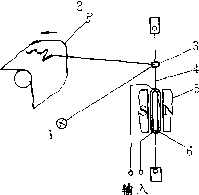 光线示波器工作原理图 1. 光源 2. 记录纸 3. 镜片 4. 张丝 5. 磁钢 6. 线圈 |