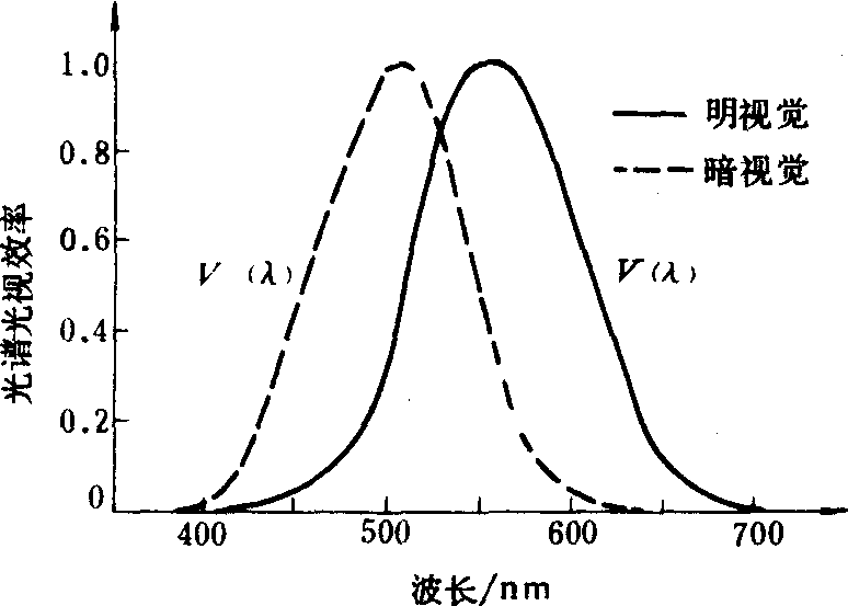 在光辐射中, 有一部分是人眼能够看见的。因为在人眼的视网膜上布满了大量的感光细胞。感光细胞有两种, 柱状细胞和锥状细胞。柱状细胞的感光灵敏度高,能感受极微弱的光: 锥状细胞感光灵敏度较低,但能很好地区别颜色。在这两种细胞里都含有一种感光物质。当光线照到视网膜上时, 感光物质会发生化学变化, 刺激神经细胞, 由视神经传到大脑, 产生视觉。实际上人眼对各种颜色光的灵敏度是不相同的,对绿光的灵敏度最高,而对红光则低得多。也就是说,相同能量的红光和绿光, 后者在人眼中引起的视觉强度要比前者大得多。不同观察者的眼睛, 对各种波长的光的灵敏度稍有不同, 而且随着年龄和健康状况以及观察时间而变化。因此, 只能从许多人的大量观察结果中取出平均值。为了实用, 必须采取一个约定的真正代表人眼特性的曲线, 作为光度测量的标准, 以便对不同颜色的光获得一个恒定的单位值光度标。国际上使用的C I E 1924标准, 是对200多个光度观测者测量得出的数据, 后经修正, 1972年国际计量委员会批准明视觉条件下所测得的。图中实曲线表示光亮度大于几个坎德拉/米2时人眼的相对灵敏度,称为“明视觉”的光谱光视效率, 其最大值在555纳米处。当光亮度小于0.01坎德拉/米2时(虚曲线), 人眼的相对灵敏度称为暗视觉的光谱光视效率, 其最大值移向波长507纳米处。