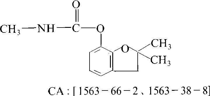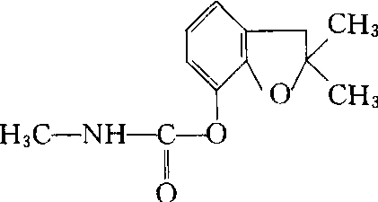 性质 纯品为白色结晶,无臭味,熔点153~154℃,33℃时蒸气压为 2.67×10-3帕,密度(20℃)1.180,25℃时在水中溶解度为700微克/千克,在苯中为4%,在乙腈中为14%,在丙酮中为15%,在二氯甲烷中为12%,在环己酮中为9%,乙醇为4%,二甲砜25%,二甲基甲酰胺27%,N-甲基吡咯烷酮30%,二甲苯和石油醚<1%。在碱性介质中不稳定,不易燃,但可点燃,无腐蚀作用。工业品为淡黄褐色,有效成分含量为90~95%,熔点147~155℃,有微弱的酯类气味。对人、畜高毒,大鼠急性经口LD50为8~14毫克/千克,狗LD50为19毫克/千克,家兔急性经皮LD50>10200毫克/千克,对眼睛和皮肤无刺激作用。在试验剂量内无致畸、致突变、致癌作用,在三代繁殖试验和神经毒性试验中未见异常,两年饲养试验无作用剂量小鼠为25毫克/千克,狗为20毫克/千克。对鱼类毒性较高,对蜜蜂安全。杀虫谱广兼有杀线虫作用。具有内吸、触杀和胃毒作用。主要从植物根部吸收传导到植物各器官,以叶部积累较多,特别是叶缘。在果实中含量极少,在土壤中半衰期为30~60天。其作用机制为抑制胆碱酯酶,但与其他氨基甲酸酯杀虫剂不同的是,其与胆碱酯酶的结合不可逆,因此毒性甚高。 应用 由于高毒,一般只加工成颗粒剂或种衣剂作土壤或种子处理使用。不作喷洒使用。常用于水稻田防治稻螟、稻飞虱、稻蓟马、稻叶蝉、稻瘿蚊;用于棉田防治棉蚜、棉蓟马、地老虎及线虫; 用于烟草苗床和本田可防治烟草夜蛾、烟蚜、烟草根结线虫、烟草潜叶蛾及地下害虫; 用于甘蔗田可防治蔗螟、金针虫、甘蔗绵蚜、甘蔗蓟马及甘蔗线虫等; 用于大豆和花生田可防治大豆蚜、大豆潜秆蝇及大豆孢囊线虫,花生蚜、斜纹夜蛾及根结线虫。 克百威carbofuran又名呋喃丹、furadan。一种高毒农药。化学名称:2,3-二氢-2,2-二甲基-7-苯并呋喃基-甲基氨基甲酸酯。化学结构式如下。纯品白色结晶,溶点153~154℃,工业品浅灰色、熔点150~152℃。密度(d2025) 1.180,33℃蒸气压266.6×10-5Pa。25℃时溶解度在水中0.07%,苯4%,乙醇4%,丙酮 15%,二 甲亚砜25%,二甲基甲酰胺27%,N-甲基吡咯烷酮30%,二甲苯和石油醚<1%,在常用溶剂中溶解度低,因此不能配制乳油。急性口服毒性LD50大鼠为11 mg/kg,经皮毒性(兔)LD50为10 200mg/kg、鱼毒LC50虹鳟为0.2 mg/L、鳟0.28 mg/kg,对鱼类剧毒。制成颗粒剂,土壤处理和种子处理,每公顷使用3%颗粒剂15~22.5 kg,可以防治水稻稻飞虱、稻瘿蚊、稻蓟马等,每公顷用3%颗粒剂随棉籽播种可以防治棉蚜保苗40天以上。