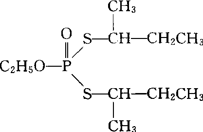 | 释义 | 克线丹Sebufos rugby,taredan有机磷杀线虫剂。化学名称:S,S-二仲丁基-O-乙基二硫代磷酸酯。化学结构式如下。原药黄色透明液体.水中溶解度248 mg/L,能完全与丙酮、乙腈、二氯甲烷、乙酸乙酯、戊烷、甲醇、甲苯混合。广谱触杀型杀线虫剂。土壤处理,防治各种线虫和地下害虫,用于花生、大豆、烟草、马铃薯等作物。对人畜毒性大,小鼠急性口服LD5071.4 mg/kg。