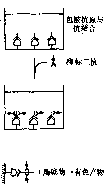 酶联免疫吸附测定法(b) 间接竞争法 前一部分与抗原包被直接竞争法相同,只是不用酶标记抗农药抗体(一抗)而是标记第二抗体,如酶标羊抗兔抗体,简称酶标二抗,在竞争结合反应之后,加入酶标二抗,使之与一抗结合,被结合的酶标二抗的量与包被抗原结合的一抗的数量变化趋势是一致的,即被结合的酶标二抗的量与待测农药的量成反比。此法的特点是一个抗农药抗体可以结合多个酶标二抗,提高了方法的灵敏度(图c)。