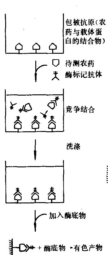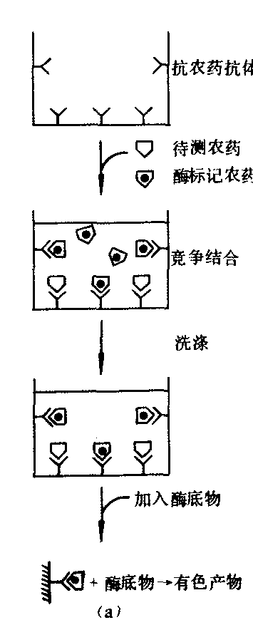 ![]() 等反应活性基团才能与蛋白质偶联;还应具有3~ 6个碳链长度的间隔臂(spacer arm),才可以突出与蛋白质偶联后抗原分子表面上具有特殊立体构型和免疫活性的化学基团,即突出抗原决定簇。大多数农药不具备上述活性基团和间隔臂,必须进行衍生化,不同衍生化方法的产物是不相同的。以除草剂禾草特为例,衍生化后的半抗原有带羧基(A,B)和氨基(C,D)4种。衍生化时应尽可能不改变半抗原分子中抗体识别基团的大小、形状、化学结构和立体构型等,因为半抗原分子结构的任何改变都会影响抗体的特异性和亲和力;相同的农药亦可在其分子的不同部位进行衍生化,得到不同特异性的半抗原。用作载体的蛋白有许多种,最常用的是牛血清蛋白、人血清蛋白,其他如兔血清蛋白与卵血清蛋白亦可使用。结合的半抗原分子与载体蛋白质的分子比称为抗原结合比,制备的人工抗原必须测定其结合比。 抗体制备 用人工抗原免疫动物时,机体内产生抗体,最常用的是体液抗体,存在于动物血清中。供免疫用的动物有羊、家兔、白鼠等。免疫剂量是影响抗体生成的因素,在免疫注射时应多设几个剂量,以每千克体重几十微克到十几毫克;可在不同间隔期免疫多次,在最后一次免疫后第七天采血试效价;抗血清的效价是指抗体和抗原发生可见反应的最大稀释度,稀释度愈大,效价愈高,血清效价达到要求后即可采血,并将制得的抗血清分瓶包装,于-20℃以下存放。 检测方法 根据标记物质不同,免疫检测法有荧光免疫法(FIA)、放射免疫法(RIA)和酶免疫法(EIA),前两种方法因试剂存放不便和需特殊仪器,已不常用。在农药残留分析中主要使用酶免疫法中的酶联免疫吸附测定法(ELISA)。不论用何种方法,都是基于农药和半抗原—载体复合物对特异性抗体的竞争结合反应。 酶联免疫吸附测定法是将抗体抗原反应的高度特异性、敏感性与酶的高度催化性有机地结合,在聚苯乙烯反应板上进行农药残留分析的方法。可分为直接竞争法和间接竞争法(见图)。 直接竞争法 将抗体包被到聚苯乙烯微孔反应板上,加入酶标记农药和待测农药,酶标记农药与待测农药之间发生与抗体的竞争结合反应。反应完成后,将反应液倒掉并进行洗涤。在反应板上加入酶底物,经酶催化而得有色产物。含待测农药多,被结合到包被抗体上的酶标记农药少,颜色减弱。反之,颜色增强。根据已知量农药的标准曲线,可定量测定待测农药的浓度(图a); 在直接竞争法中,也可将人工抗原包被到反应板上,再加入酶标记抗体和待测农药,结合在反应板上的酶标抗体的量与溶液中待测农药的含量成反比(图b)。