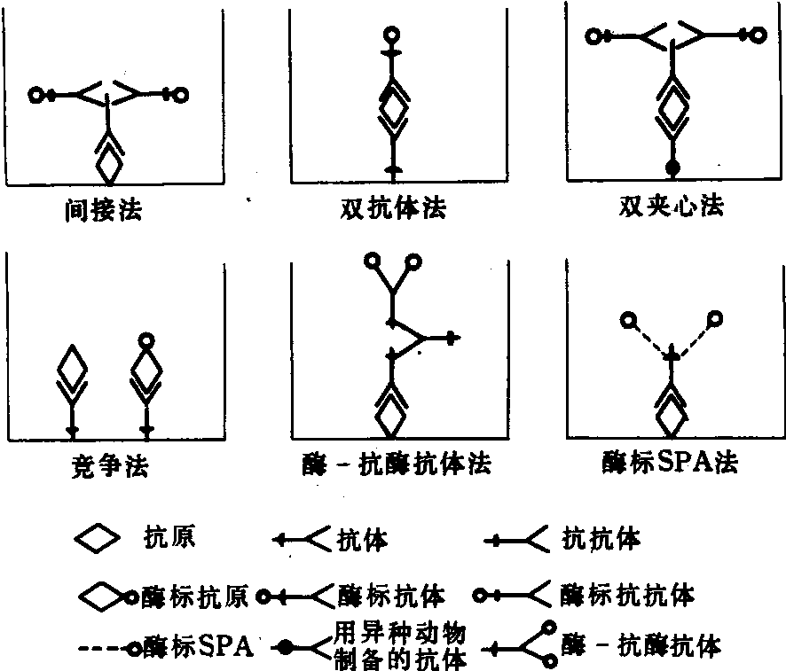 双抗体法 其原理与放射免疫测定相似,将待检抗原与已知量抗体作用,再加入一定量的酶标抗原使与剩余的抗体结合,最后加入抗抗体(二抗)使抗原抗体复合物沉淀,在沉淀物中加相应的底物显色,待检抗原的量与显色反应强度成反比。 均质酶免疫测定(HEI) 本法将抗原、抗体、酶标记物和底物加在一起,反应结束后,即可直接测读结果,操作简便,重复性好,适于一般实验室及野外条件下进行测试。HEI的具体方法种类很多,其原理、试验方法、结果检测和适用范围也各不相同,早先仅用于测定药物和激素等半抗原,现已能测定大分子蛋白质抗原和病毒、细菌等抗原; 也可用以测定特异性抗体,其灵敏度已接近RIA,是一种很有前途的免疫酶测定技术。 常用的有代表性的均质酶测定法:❶标记抗原法。某些酶,如苹果酸脱氢酶用以标记某些半抗原分子时,标记物中的抗原仍保持与抗体结合的能力,酶活性则受到强烈的抑制。但当标记物中抗原与抗体结合后,又可恢复酶活性,试验时,将待测标本、标记试剂、抗体和底物溶液依次混合,待反应平衡后,测定反应产物,即可根据竞争结合原理(见放射免疫测定),通过标准曲线,计算出标本中抗原含量。另一些酶,如溶菌酶与半抗原结合后,酶活性可保持不变,但当标记物中抗原与抗体结合后,则酶活性明显抑制。试验时,将待测标本、标记试剂、抗体和作为固相底物的微球菌混合作用后,即可直接用比浊法(436nm)测定菌体溶解后的浊度变化。根据竞争曲线计算出标本中抗原含量,如用带色素的细菌,如藤黄色微球菌则可根据颜色深浅,测出抗原量; ❷标记辅基法。本法常用的是葡萄糖氧化酶,在酸性条件下可解离成酶朊和辅酶——黄素腺嘌呤双核苷酸(FAD)。两者单独存在均无酶活性,如将FAD标记在抗原分子上,游离标记物中的FAD仍能与酶朊重组成有活性的全酶。但当与抗体结合后,即失去重组能力,因此在待测抗原、标记试剂和抗体竞争结合反应平衡后,再加入葡萄糖氧化酶朊,然后测定酶活性,即可按竞争法原理计算出抗原含量。在试验设计中葡萄糖氧化酶的活性是通过另一组配对酶——过氧化物酶底物系统来显示的。葡萄糖氧化后的产物是H2O2,可作为过氧化物酶的底物,使有关供氢体氧化成有色产物,根据颜色深浅标示酶的活性。 酶联免疫测定(ELISA) 是当前应用最广、发展最快的一项免疫测定技术,其基本过程是在固相载体上进行抗原抗体反应和免疫酶染色,底物显色后用肉眼或专用ELISA测定仪判定结果,常用的载体为96孔或40孔的聚苯乙烯滴定板,小孔呈凹形,操作简便,剂量少,适于大批样品的检查。 操作步骤: ❶包板。在载体上包被抗体或抗原; ❷结合反应。抗原抗体在固相载体上反应后洗去未结合物,再加入第二层或在第二层上再加第三层,每加一层均需洗涤,但最后一层必须是标记酶的结合物。视层次和所叠加的材料不同有间接法、双抗体法、双夹心法、竞争法、酶-抗酶抗体法和酶标SPA法等 (见图); ❸底物显色。如酶为HRP时,底物为H2O2,供氢体通常为OPD。底物溶液(OPD、H2O2溶液)应在试前新鲜配制,加入各孔作用20~30分钟,加浓硫酸终止反应; ❹结果判读。可用肉眼观察,颜色显著深于空白对照者判为阳性,如用以定量时,需用 ELISA测定仪测定。