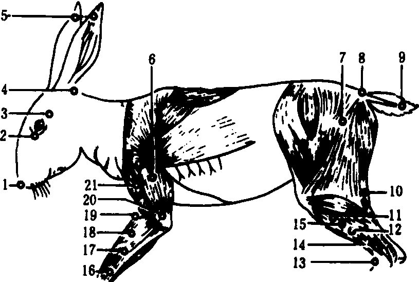 图3 兔左侧面穴位 耳尖(erjian) 又名血印。位于耳尖背侧血管上,左右侧各一穴。以小三棱针对准血管直刺出血。主治中暑、中毒、感冒。 风门(fengmen) 又名风池。位于耳根后下方,寰椎翼前缘下部与腮腺之间的凹陷中,左右侧各一穴。毫针向内下方斜刺0.5~1厘米。主治颈肌风湿、感冒、抽搐。 顺气(shunqi) 又名鼻腭管。位于上腭褶前方, 后门齿后缘2毫米处的两侧纵裂孔中,左右侧各一穴。巧治, 可用松针或细草茎秆(涂油)从鼻腭管中向后上方插入达鼻腔中1~1.5厘米,剪去外露部分后让其留置。主治结膜炎、感冒。 承浆(chengjiang) 位于下唇正中, 有毛与无毛交界处, 一穴。毫针或三棱针向后下方斜刺0.2~0.3厘米。主治消化不良、口炎。 陶道(taodao) 位于第一、二胸椎棘突间正中,一穴。毫针顺棘突间向前斜刺0.5~1厘米, 也可灸。主治前肢扭伤、热性病。 身柱(shenzhu) 位于第三、四胸椎棘突间正中,一穴。毫针顺棘突间向前斜刺0.5~1厘米,也可灸。主治肺炎、支气管炎、胸背部及肋间神经痛。 至阳(zhiyang) 位于第七、八胸椎棘突间正中,一穴。毫针顺棘突向前斜刺0.5~1厘米, 也可灸。主治腰背神经痛、食欲减退、肠臌气、支气管炎。 筋缩(jinsuo) 位于第八、九胸椎棘突间正中,一穴。以毫针顺棘突向前斜刺0.5~0.8厘米,也可灸。主治肝胆疾患。 命门(mingmen) 又名肾门。位于第二、三腰椎棘突间正中,一穴。毫针直刺0.2~0.3厘米,也可灸。主治风湿症、腰部扭伤、肾炎、慢性肠炎和泌尿器官机能障碍。 阳关(yangguan) 位于第四、五腰椎棘突间正中,一穴。毫针直刺0.2~0.3厘米, 也可灸。主治生殖机能减退、子宫炎、风湿症。 百会(baihui) 又名千金。位于第七腰椎与第一荐椎棘突间凹陷正中, 一穴。毫针直刺0.5~1厘米, 也可灸。主治后肢瘫痪、腰胯风湿、盆腔器官疾患。 尾根(weigen) 位于第四荐椎与第一尾椎棘突间正中, 一穴。毫针直刺0.2~0.3厘米, 也可灸。主治后肢瘫痪、便秘或腹泻。 尾尖(weijian) 位于尾末端, 一穴。毫针或三棱针点刺出血。主治中暑、中毒、消化不良、精神不振、热性病。 后海(houhai) 位于尾根与肛门之间的凹陷处,一穴。毫针稍向前上方刺入2~3厘米, 也可施水针。主治便秘、腹泻、脱肛。 催情(cuiqing) 位于髋结节内角前缘与第六腰椎横突后缘间, 左右侧各一穴。毫针稍向后直刺3~4厘米,针尖达卵巢附近,以电针效果较好。主治不孕症。 心俞(xinshu) 位于第五、六胸椎棘突间旁开约1.5厘米的凹陷处, 左右侧各一穴。将前肢向前拉,于肩胛骨后缘用毫针沿第六肋骨前缘向内下方斜刺0.5~1厘米, 也可灸。主治心悸、躁动不安。 肺俞(feishu) 位于第三、四胸椎棘突间旁开背中线约2厘米的第三肋间, 左右侧各一穴。毫针沿肩胛软骨内侧向下斜刺0.5~1厘米,也可灸。主治肺炎、支气管炎。 肝俞(ganshu) 位于倒数第三肋间距背中线2厘米凹陷处,左右侧各一穴。毫针向内下方斜刺1厘米,也可灸。主治肝胆疾患、眼病、脊背痛。 脾俞(pishu) 位于倒数第一肋间, 距背中线约2厘米的凹陷处,左右侧各一穴。毫针向后下方斜刺1厘米, 也可灸。主治消化不良、腹泻、贫血。 三焦俞(sanjiaoshu) 位于第二腰椎横突的前角,离背中线2厘米的凹陷处, 左右侧各一穴。毫针沿第二腰椎横突前角向下斜刺1厘米, 也可灸。主治食欲不振、腹泻。 肾俞(shenshu) 位于第三腰椎横突的前角,离背中线约2厘米的凹陷处, 左右侧各一穴。毫针沿第三腰椎横突前角向下斜刺1厘米, 也可灸。主治食欲不振、腹泻。 膻中(shanzhong) 又名理中。位于两前肢间,胸骨的后三分之一与中三分之一交界处,一穴。仰卧,毫针向后斜刺0.5厘米,也可灸。主治支气管炎、乳汁分泌不足。 中脘(zhongwan) 位于腹中线,离剑突2厘米处,一穴。仰卧,毫针直刺或向后斜刺2厘米,也可灸。主治急性胃炎、胃臌气、食欲不振。 乳基(ruji) 位于每个乳头的外侧缘各一穴,共6~12穴。仰卧保定, 毫针或小三棱针向内斜刺0.3厘米。主治乳房炎。 抢风(qiangfeng) 位于肩关节后缘凹陷处, 左右侧各一穴。毫针直刺0.5厘米。主治前肢跛行、扭伤、风湿症。 臂臑(binao) 位于肘上、肩关节外侧, 肘窝横纹上约6厘米的三角肌肩峰部, 左右侧各一穴。毫针直刺0.5厘米, 也可灸。主治前肢麻痹、肩关节病。 曲池(quchi) 位于肘关节前外侧凹陷中, 左右侧各一穴。毫针直刺1厘米,也可灸。主治前肢瘫痪、肘关节疾患。 肘俞(zhoushu) 位于肘窝中,左右侧各一穴。毫针直刺0.5厘米。主治肘关节炎、尺神经麻痹。 四渎(sidu) 位于肘头下约4厘米的桡尺骨间隙处,左右肢各一穴。毫针向内侧刺入0.5厘米,也可灸。主治喉头炎、前臂部病症。 前三里(qiansanli) 位于桡骨前缘, 肘关节前外侧凹陷下约2厘米处, 左右肢各一穴。毫针沿桡骨前缘直刺0.5厘米。主治桡神经麻痹、前肢肌肉风湿。 外关(waiguan) 位于前臂背侧,距腕关节上方约1.5厘米的桡尺骨缝间,左右肢各一穴。毫针沿着桡尺骨缝间直刺0.5厘米。主治前肢瘫痪、感冒、热性病。 内关(neiguan) 位于前臂腹侧,离腕关节约1.5厘米的桡尺骨缝间, 左右肢各一穴。毫针沿桡尺骨缝间直刺0.5厘米。主治腹痛、前肢麻痹。 合谷(hegu) 位于前肢第一、二掌骨之间, 近第二掌骨中点的桡侧, 左右肢各一穴。毫针稍向内上方斜刺0.5厘米, 也可灸。主治鼻炎、前肢瘫痪。 指间(zhijian) 位于前脚部, 从第二指起, 每两指间的掌指关节间后缘各一穴, 左右肢各三